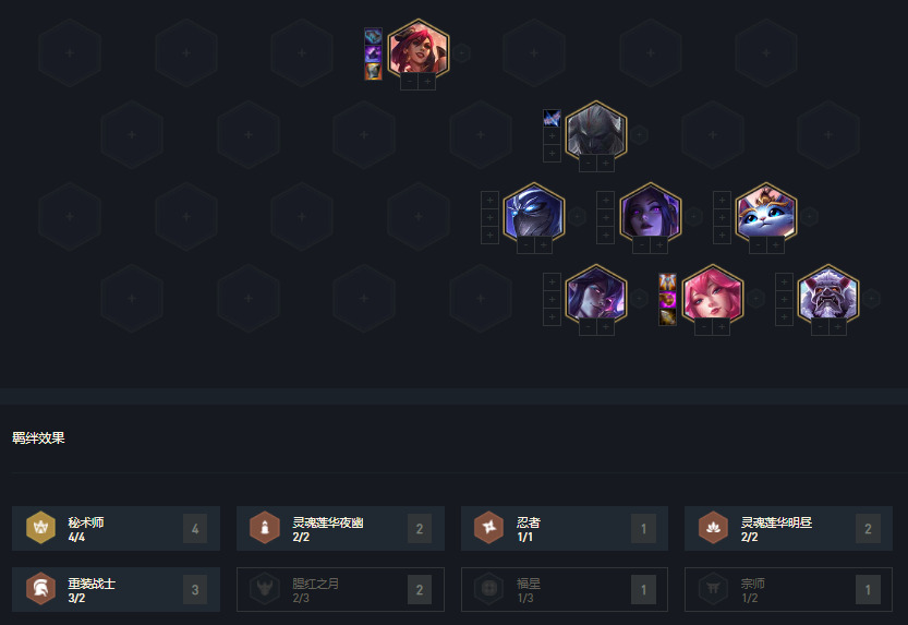 此阵容关键点是站位,阿卡丽一点和另一个刺客棋子一起跳一面减少阿卡丽受到的伤害。派克通常在阿卡丽的另一面。