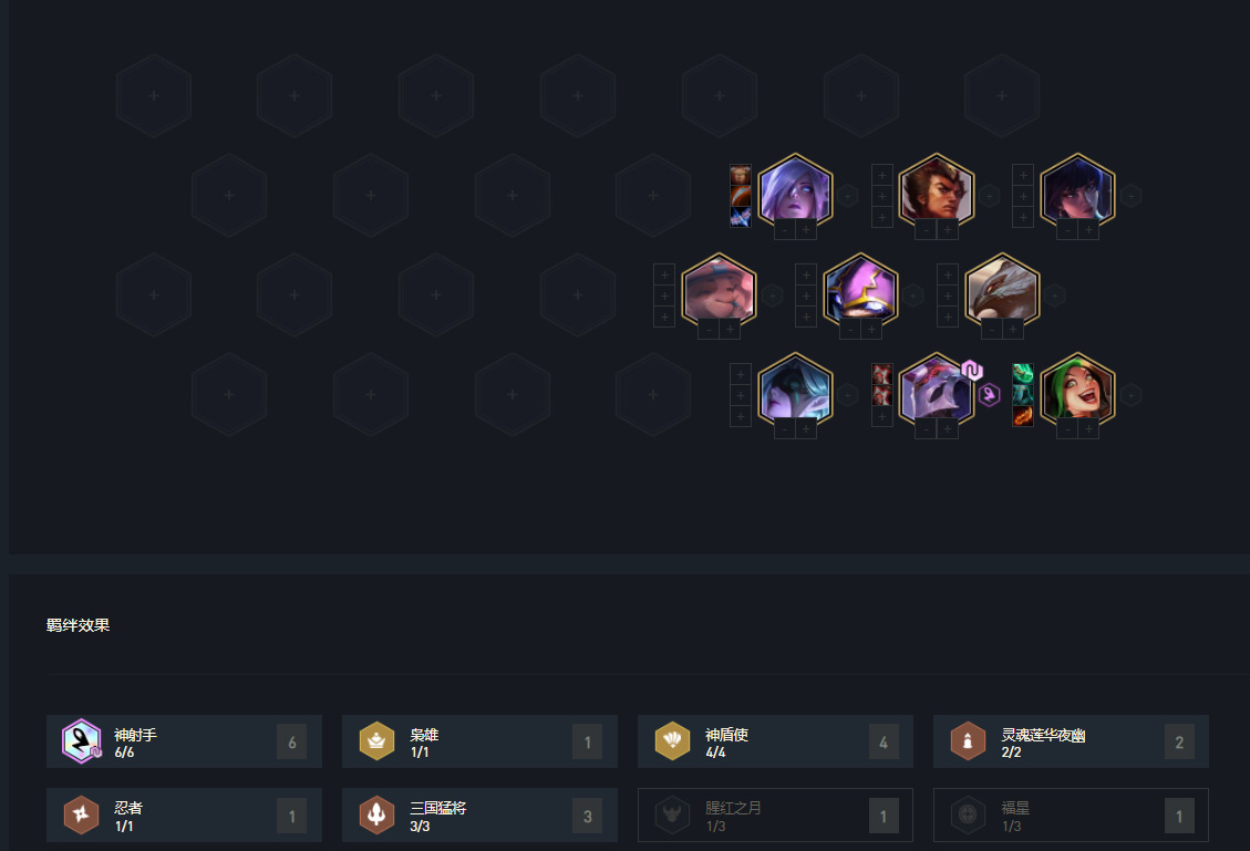 阵容装备核心就是基克、圣杯、鸟盾、这三大辅助装备,可完美契合神盾,双基克开局就能增加3枚神射的80%基础攻速,异常强势,搭配鸟盾圣杯,射手人人可C,比传统单C装备泛用性更强。