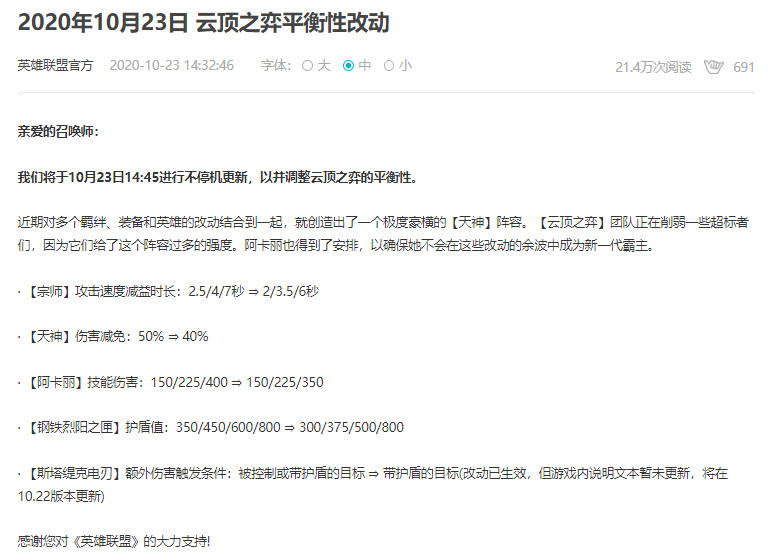 今天英雄联盟官网在下午2:32分发布公告对云顶平衡性进行改动。喜大普奔,对我们云顶玩家来说简直是脱离苦海,喜得重生,电刀终遭削弱。