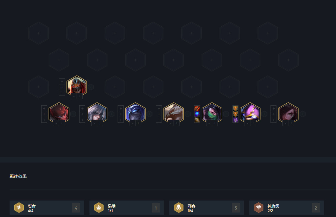 阵容构成:慎、派克、劫、卡特、沙皇/永恩/时光(8级)、阿卡丽、凯南、难道