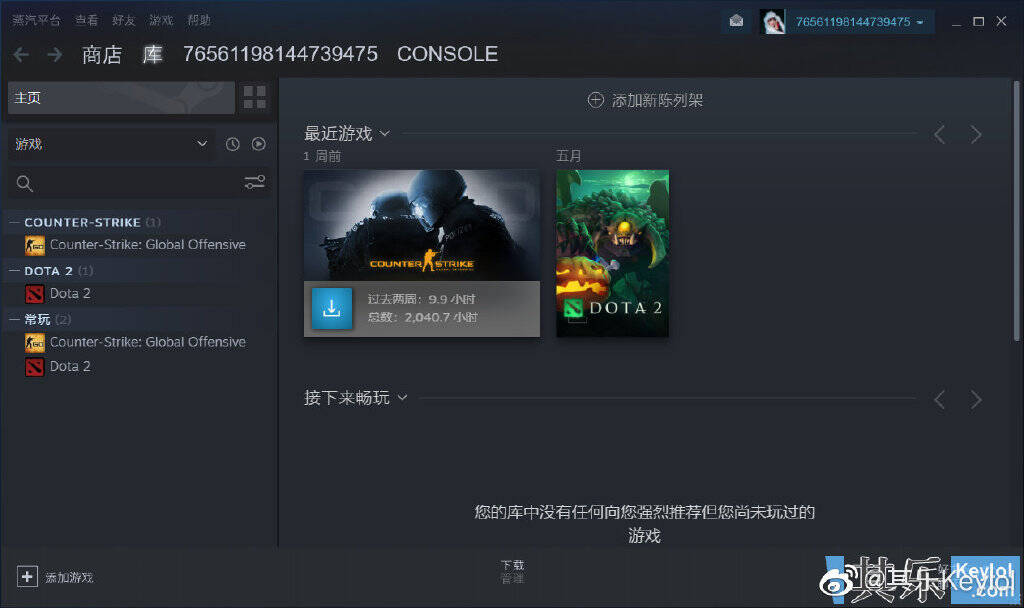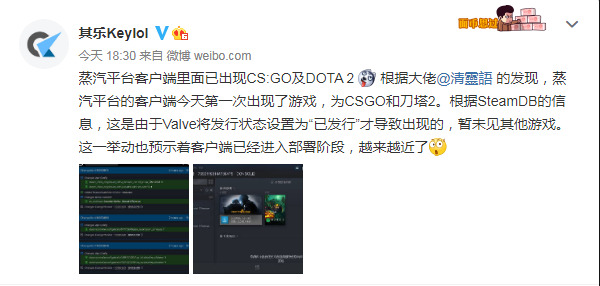 @其乐Keylol:蒸汽平台客户端里面已出现CS:GO及DOTA 2 [二哈] 根据大佬@清靈語 的发现,蒸汽平台的客户端今天第一次出现了游戏,为CSGO和刀塔2。根据SteamDB的信息,这是由于Valve将发行状态设置为“已发行”才导致出现的,暂未见其他游戏。这一举动也预示着客户端已经进入部署阶段,越来越近了。