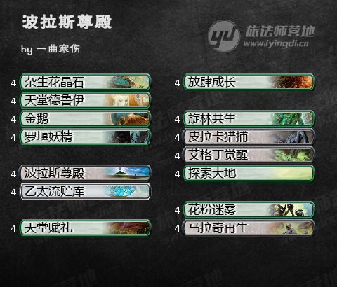 然后是套牌的“法术力基础”。由于组合技达成要求的限制,这套牌没有一张真正意义上的地,取而代之的是各种各样的咒语地。这一部分选取单卡的主要标准中,最重要的是尽量能在没有任何目标的情况下施放。如果一定要指目标,那最好是指自己的生物,毕竟这套牌在组合技启动时除非上回合对手刚刚扫场,否则多少会有几个生物。另外也比较重要的是法术力费用不能太高,不然生拍尊殿强行启动很可能会把自己烫死。也正是因为这个原因,作者最后还是没有在这套牌中使用白色秘稀双面牌伊美黎召令(七费实在是太烫了)。目前牌表中大部分的双面牌都是根据这两个标准选择的,但有两个例外:带塞基黎庇护是因为实在缺少白色法术力源,而带座孚汲取主要是因为这张牌虽然法术力费用高达六费但可以吸4点,一般情况下可以当作两费看待。最后提一下关于这套牌要不要带一张黑白圈的问题。因为尊殿可以从牌库顶下地而这套牌的地大多横进,拍下尊殿的当回合有时是没有下过地的,所以带一张黑白圈理论上并不会太影响组合技的运作,这也是为什么它出现在了早期的构筑中。但后来作者发现一张圈地远远不足以改善法术力基础,而六回合却时常会需要竖进艾格丁觉醒拍尊殿,于是后面就把它去掉了。