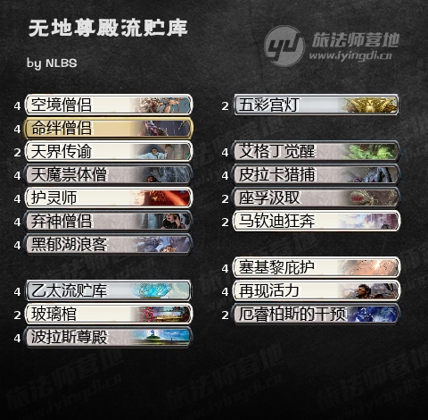 确定了套牌构筑的要求之后,接下来谈一谈色组的选取。事实上由于组合技本身只有黑色而各个颜色都有咒语地,理论上而言所有的沾黑双色色组都是有开发潜力的。但其余色组中,纯黑没有足够的咒语地,而三色或更多颜色的色组由于极其不稳定的法术力基础可以说几乎不可能组出合理的套牌。作者在构筑时最终选择的是黑白色组,主要原因是黑白拥有这四个色组中最为强大的回血能力,能为尊殿启动打好基础,同时僧侣体系使得每一个进场的僧侣都能回复两三点生命值,极大降低了拍下尊殿后,找到流贮库前因为血量不够而被卡住的几率。第二点优势也让这套牌从尊殿流贮库的两卡组合技变成了只需要尊殿在场的伪单卡组合技,相当于间接提升了套牌稳定性。不过黑白色组也存在一些问题,其中之一就是滤牌严重不足,导致抓尊殿经常只能靠掏……