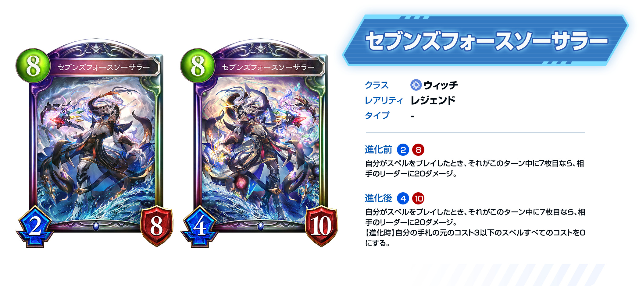 每当自己使用法术时,如果是本回合中自己使用的第7张法术,则会给予对方的主战者20点伤害。