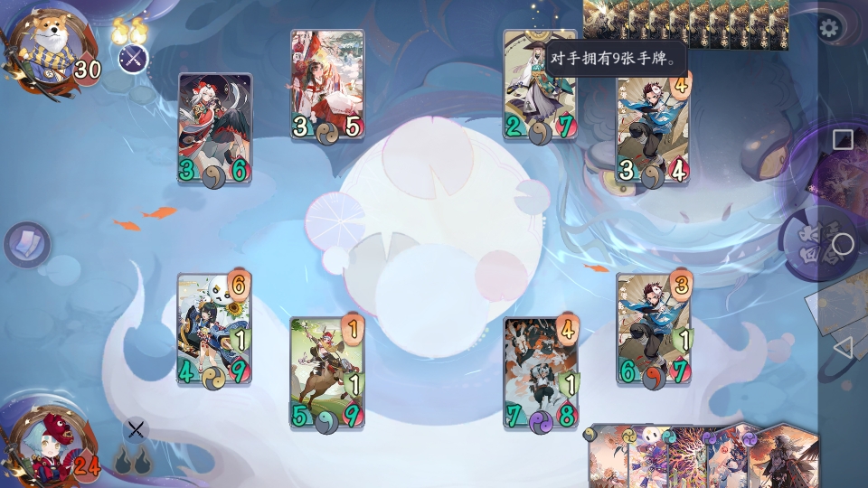 一之型•水面斩击:表面上平平无奇的一张战斗牌。但是在这套牌中有很强的作用。想想镰鼬为什么退役?不就是二太郎多加了一点能量。如果能用水面斩切掉对面式神,镰鼬出击加一能就可以打出二太郎,造成10+的伤害。
