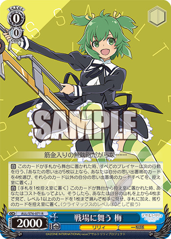 【自】高潮联动 此卡攻击时,高潮区存在「二人の射程」,其他的你的含有《リリィ》特征的角色存在的话,你选对手等级0以下的角色最多1张,放到休息室,公开自己卡组顶1张。那张卡等级1以上的话加入手牌。(高潮卡视作0级,不是那样的话还原)