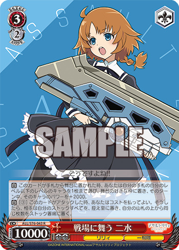 【自】高潮联动 你的高潮区放上「シュッツエングルとは」时,此卡在前列,你的角色全都含有《リリィ》特征的话,你选其他自己最多1张角色,回到手牌,那个回合中,此卡得以下能力。「【自】你的攻击阶段开始时,你选其他的自己的1张含有《リリィ》特征的角色,竖置,那个回合中,那张角色攻击力+1000。」