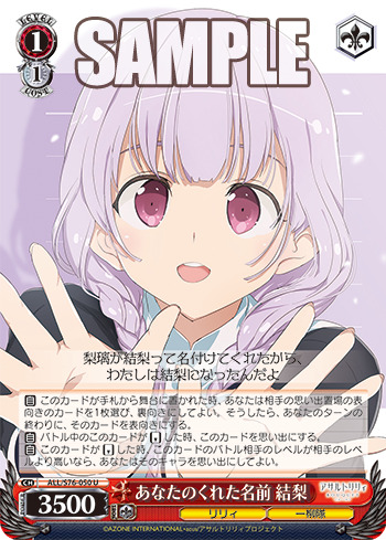 【永】你的所有角色都 含有《リリィ》特征的话,此卡攻击力+1500,此卡得以下能力。「【自】[1张手牌放到休息室] 此卡被正面攻击时,你可以付这个费。那样的话,此卡回手。」