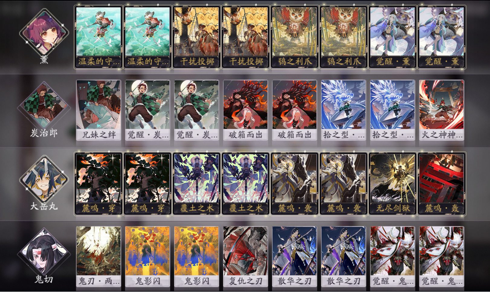 其他式神在构筑上与常规无异。炭弥这里满编了破箱而出来弥补中期的压制效果。到今天为止,天梯上所有炭治郎的带牌模式就都介绍过了。有满编三勾牌的核心带法(青缘,双刀炭),有注重解场能力和站场能力的带法(灯火,能量炭),有满编战斗牌侧重进攻端的带法(快攻炭),最后就是今天这种侧重站场和斩杀能力的带法(大妖炭)。那么炭弥的各种玩法的带牌模式就都介绍完了,大家可以根据不同的卡组构筑需求选择不同的带牌模式。