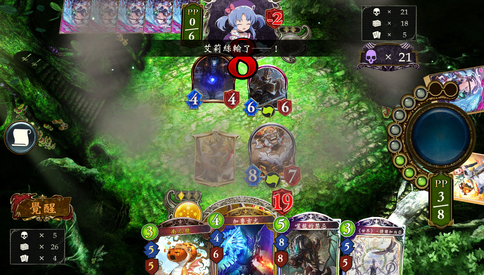 相比之下,仅需4费,且不需要进化便能打出AOE的神异形·迪亚马特与万花配合更好。在未觉醒状态下,她们便能合力提供4点回复,解决单个5血随从和复数1血随从,也能降低其他敌人的攻击力,减少进化万花的节奏亏损。迪亚马特还有机会在第3回合登场,或是在费用充裕后配合乔治解决大量高血量随从,用法十分灵活。