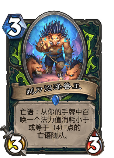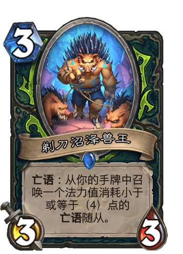 今年恶魔猎手的新卡设计似乎显得更温和了一些,亡语体系基本都是配合牌,职业牌中并没有新的优质亡语随从作为体系的支撑。而这三张召唤亡语的随从牌的效果是分别拉出3、4、5费及以下的亡语随从,也使得此前推出的诸如邪能召唤师和盘牙督军这样的大恶魔体系无法与之糅合到一起。因此实际上我们就只能去旧卡和中立卡中寻找合适的亡语配合,而一般来说,我们更希望剃刀野猪的亡语拉出剃刀沼泽兽王,并用兽王的效果来继续拉出4费的亡语随从,而5费的亡语随从则只能与橙卡亡语者布莱克松进行配合,所以我们的主要筛选目标就是4费的亡语随从。而经过筛选,我得到了以下几个选择: