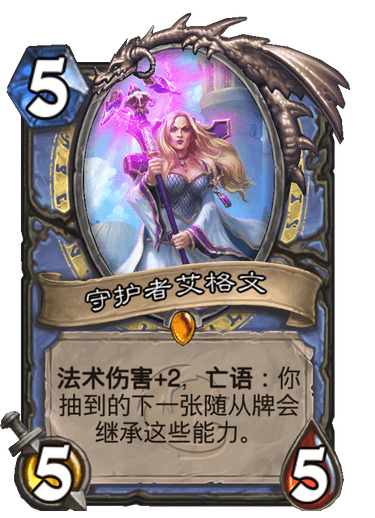 艾格文的特效可以将她的法强效果一直传递下去,而为了最大化利用法强效果,显然传递给低费随从是更划算的,而如果为了利用法术伤害打爆发,传递给既低费,本身又自带法术伤害的随从就更优了,而目前环境里最佳载体显然是被禁锢的凤凰,而在必要时,诸如星术师索兰莉安、血法师萨尔诺斯等牌也可以作为载体使用。