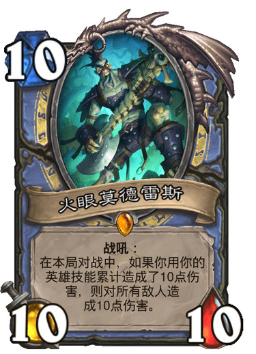 如果英雄技能可以打2,这张牌就已经足够强大了,而在中后期,一次打出3-4点的AOE,还能附带打脸就更离谱了。不过目前还不清楚它的效果是否会触发火眼莫德雷斯的计数器,当然我认为是可以的。