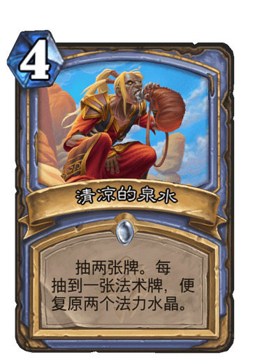 不过与以往的真菌宝藏类似的是,这张牌也可以在随从占比较少的卡组中发挥作用,不过随着各种冰系法术和哀绿都离开标准环境,另一个非常适合它发挥的卡组决斗法也会不复存在。而奥秘法的法术与随从占比是大致相当的,那么清凉的泉水相当于平均2费抽2,而由于4费抽2可能导致的崩盘,因而我也不太看好它进入奥秘法的构筑中。