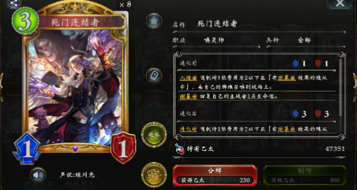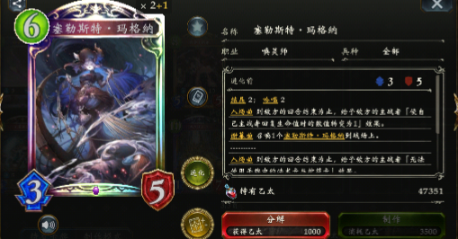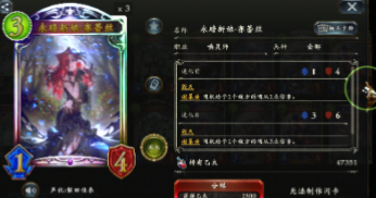 蜃景是任务的第2个收益卡,同时自身也是一个不错的任务卡。tokey一刀是除新娘外后期的第2种直伤,一般配合场面压制,死灵冲击可以打出很高的斩杀。也同样可以被恋人船妈反复拉出来拿刀,一般对局中尽量保证自己手上有两个以上的刀。开局一般是不留该牌,因为第1张牌的谢幕曲会,因为吃墓效果无法拿到刀。不过如果手牌中有船妈,可以考虑2c出,3~4c送掉。保证前期节奏不崩,同时再被船妈拉出,墓地中有两个蜃景的话,也可以保证后续更容易被恋人拉出。