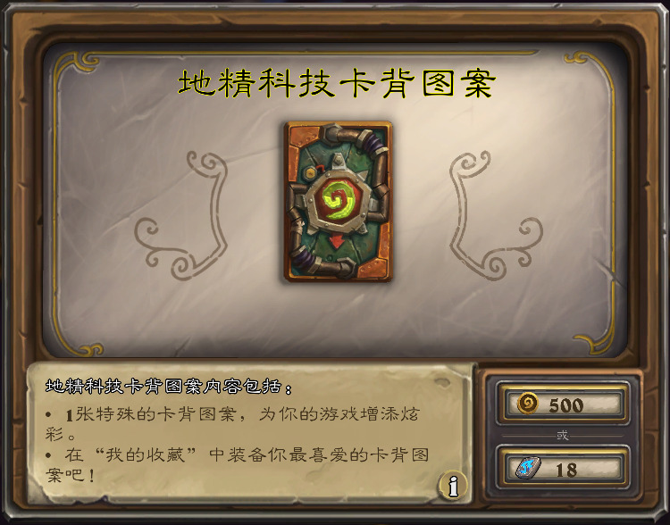 绝版卡背“地精科技”回归,国服售价500金币/18符文石。此前它是2014年11月的赛季卡背。