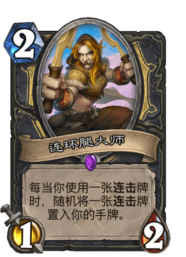 连环腿大师是一张被低估的单卡,尤其是当我们原定的游戏计划由于种种原因受挫从而使对局走向失控时,她能够为你迅速补充大量资源,重新组织攻势。而在另一些需要通过消耗取胜的对局中,反复回收连环腿大师也能让对手疲于应对,为我们进行斩杀创造机会。值得一提的是,连环腿大师的扳机在打出卡牌时,这意味着利用加基森摆渡人回收连环腿大师时仍然可以获得一张连击牌,同时也是我们投入加基森摆渡人的一大原因。