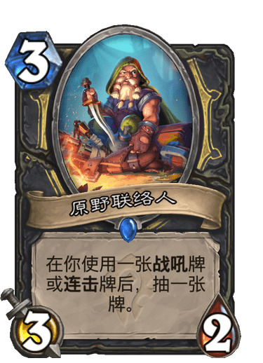 原野联络人与秘密通道是极其高效的抽牌手段,这两张单卡能够让我们与对手迅速拉开卡差,同时更快地抽到致胜单卡。然而要发挥这两张单卡的最大威力,首先必须针对性的进行特化构筑。为此,我们会尽可能多的携带低费单卡,并且更优先考虑那些具有战吼与连击异能的单卡。这样做带来的额外好处是在对局的早期我们往往能够主动地占据场面,而在中后期又能够大量倾泻手牌,将卡差转变为给予对手的压力。