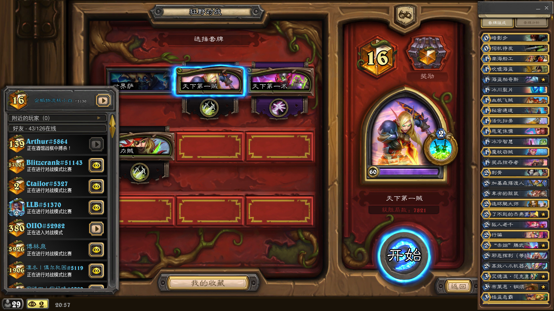 在新版本上线后,宇宙贼得到了巨大的补强,一众核心单卡的加入让这套牌的强度与操作难度直线上升,并且在甩笔侏儒遭到削弱之前到达顶点。以至于在这一时刻宇宙贼竟然成为了天梯上潜行者的主要形态,并且随着时间的推移许多玩家很快便熟练掌握了宇宙贼的玩法,在环境尚未稳定时突破了火妖法与哨所骑的封锁,甚至在外服占据了天梯榜首的位置。在与这些玩家中的一部分交流时,我对他们所表现出的高涨热情与强大学习能力感到非常震撼,这也促使我萌生了写下这篇讲座的想法:让更多玩家加入到构筑套牌的行列中来。