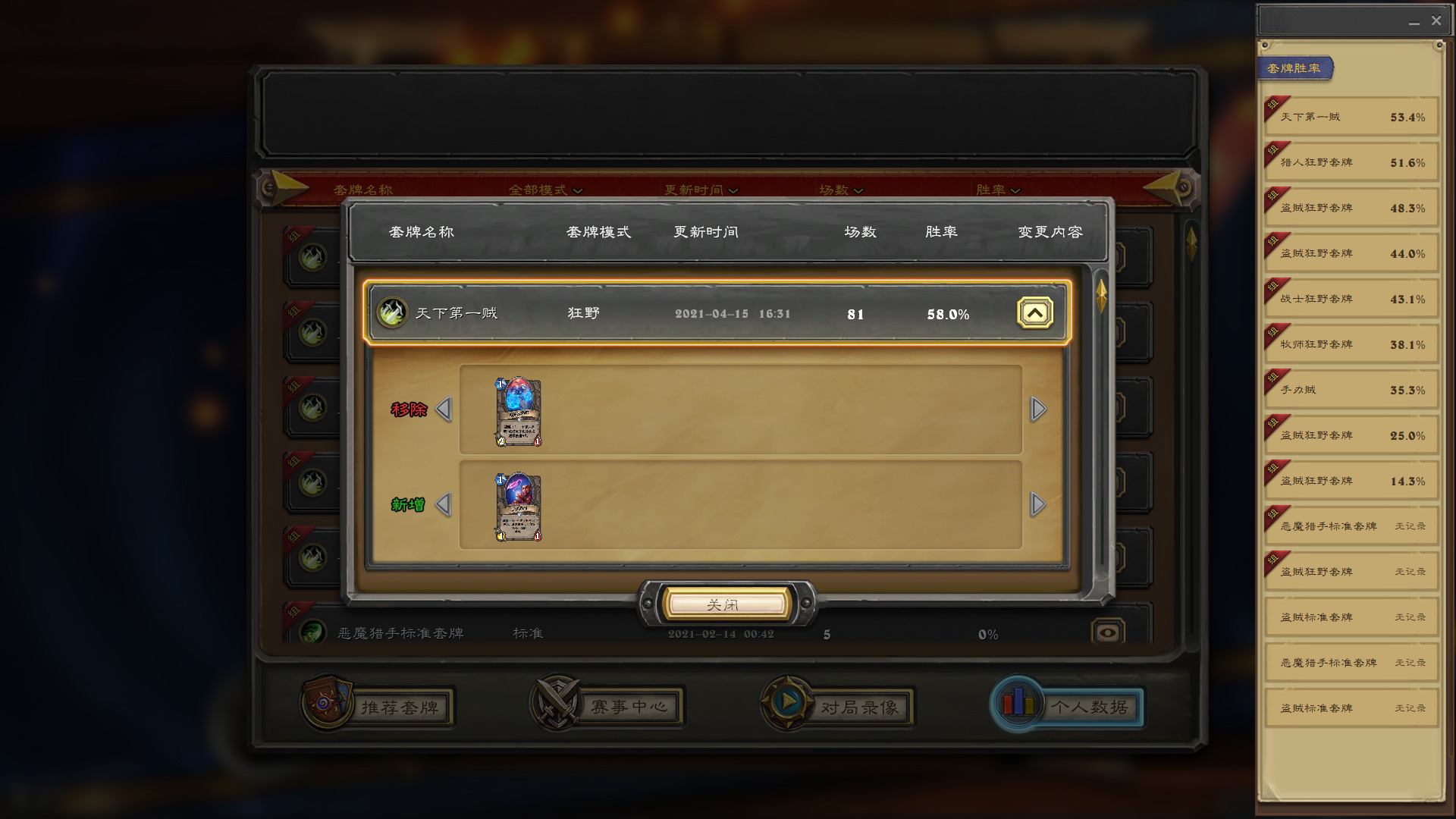 上面这套牌是我目前正在使用的,并且以58.0%的胜率最高打到传说第10名。鉴于学业繁忙及个人水平有限,很遗憾未能用这一套牌打出更好的战绩。在正式开讲之前,我先谈谈自己在调试卡组过程中的体验。