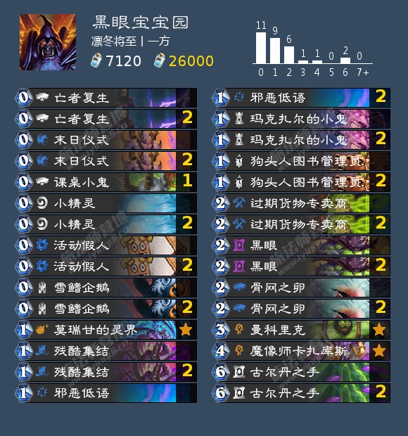来自 凛冬将至丨一方 的一套黑眼宝宝园,他以69场60%的胜率打进了国服前一百。这套卡组是外挂了黑眼的宝宝园,针对宝宝园前期强势但后续不足,容易吃一波解场就无力回天的特点,进行了大胆的改良。姐夫因为大部分时间卡手,故舍弃。这套卡组基本就是站场打伤害的剑宗宝宝园,放弃了魂火力代等前期会卡手的牌。卡组带上曼科里和新卡扎。因为这套过牌速度快所以触发找老婆的概率非常大,新卡扎能帮我们返场和打卡差或滚雪球。
