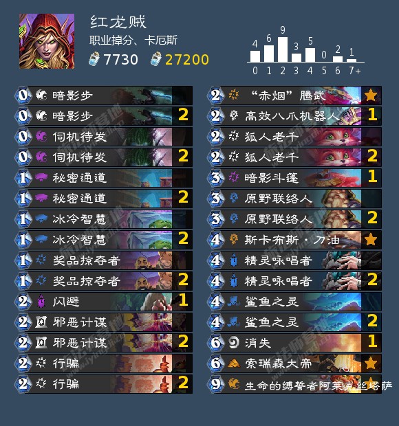 来自 职业掉分、卡厄斯的一套红龙贼,他用这套在传说分段打出了16—4的战绩。作者别出心裁,利用新红龙来实现otk,整体上非常有创意。
