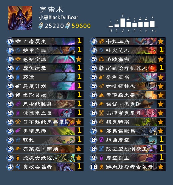 来自 b站up小黑BlackEvilBoar的一套宇宙术,他以42场72%的胜率打上了传说。构筑上针对这版本的环境进行了大胆的改良,舍弃了传统的芬利加灰发巫师的换技能组合,也放弃了铁锈特使加恩佐斯打术士内战。卡组亮点在于加入恶魔计划和咖啡师,整体曲线较低,总体思路和一般的宇宙术区别不大,但在构筑上进行特化来针对火妖法和奥秘法。补丁过后环境渐渐被法师所掌握,脏鼠、赛布和恶魔计划都是针对火妖法的大杀器,奥秘吞噬者也能很好应对奥秘法。