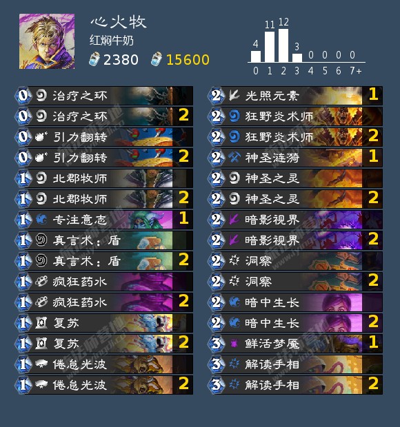 来自 红焖牛奶 的一套心火牧,他以27场67%的胜率打上了传说。心火牧一直是一套冷门而小众的卡组,以前心火环牧的一大缺点就是不稳定性,这套心火环牧只带了五个随从和双洞察来提高北郡和炎术士的上手率,快速过牌后利用倦怠光波和疯狂药水进行偷鸡斩杀。最基础斩杀公式:倦怠光波+疯狂药水+翻倍+反转+鲜活梦魇。(梦魇可以复制疯狂药水的冲锋效果)其中可以加入各种buff提高斩杀。卡组还加入了专注意志这张牌来应对多墙的情况顺带提高斩杀线。