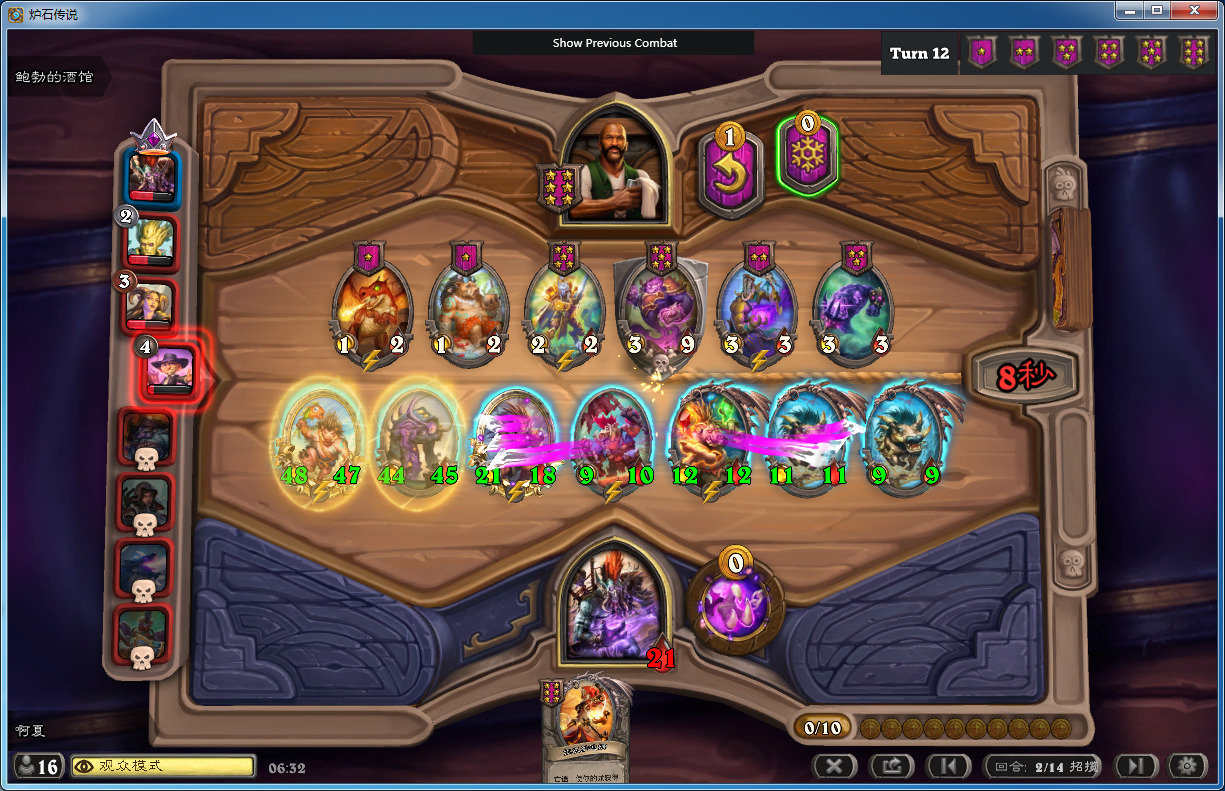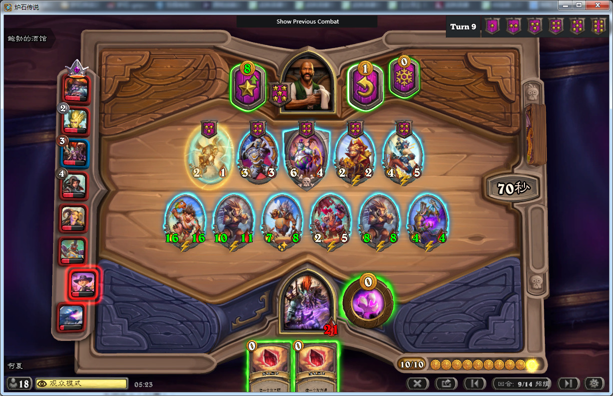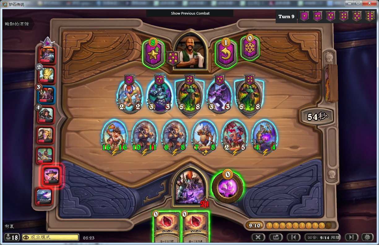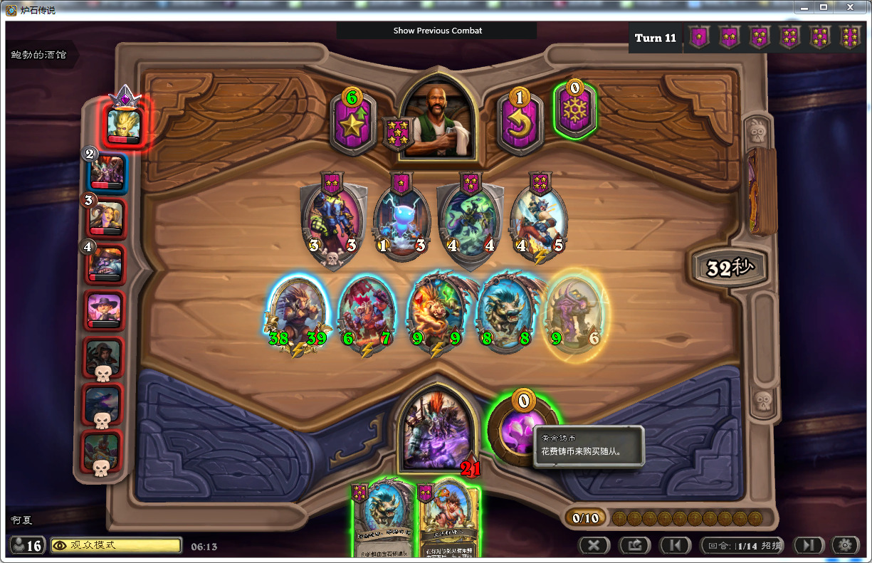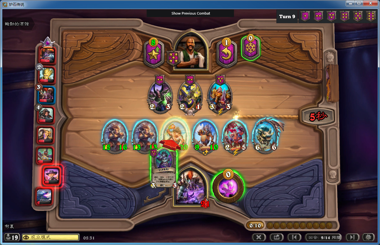九回合上(11费):9回合开始,算是游戏的后期了,从这里开始,每回合死人就是常态了。心存侥幸者,都要被抬走。而我,一如既往的,鲍勃搞我。而这篇攻略最精彩的部分,也从这里开始。这些随从放在以前的版本都是好东西,但野猪人压根瞧不上他们。我D了一手。