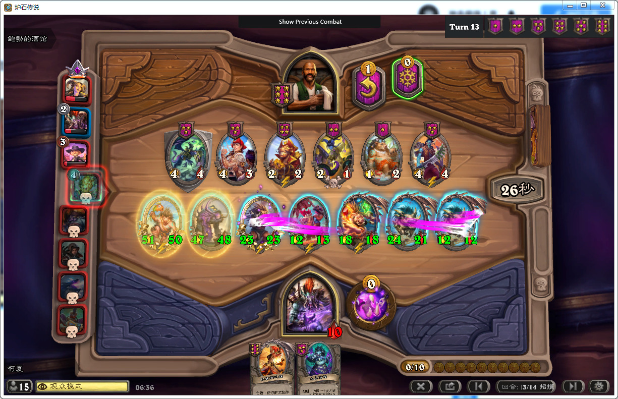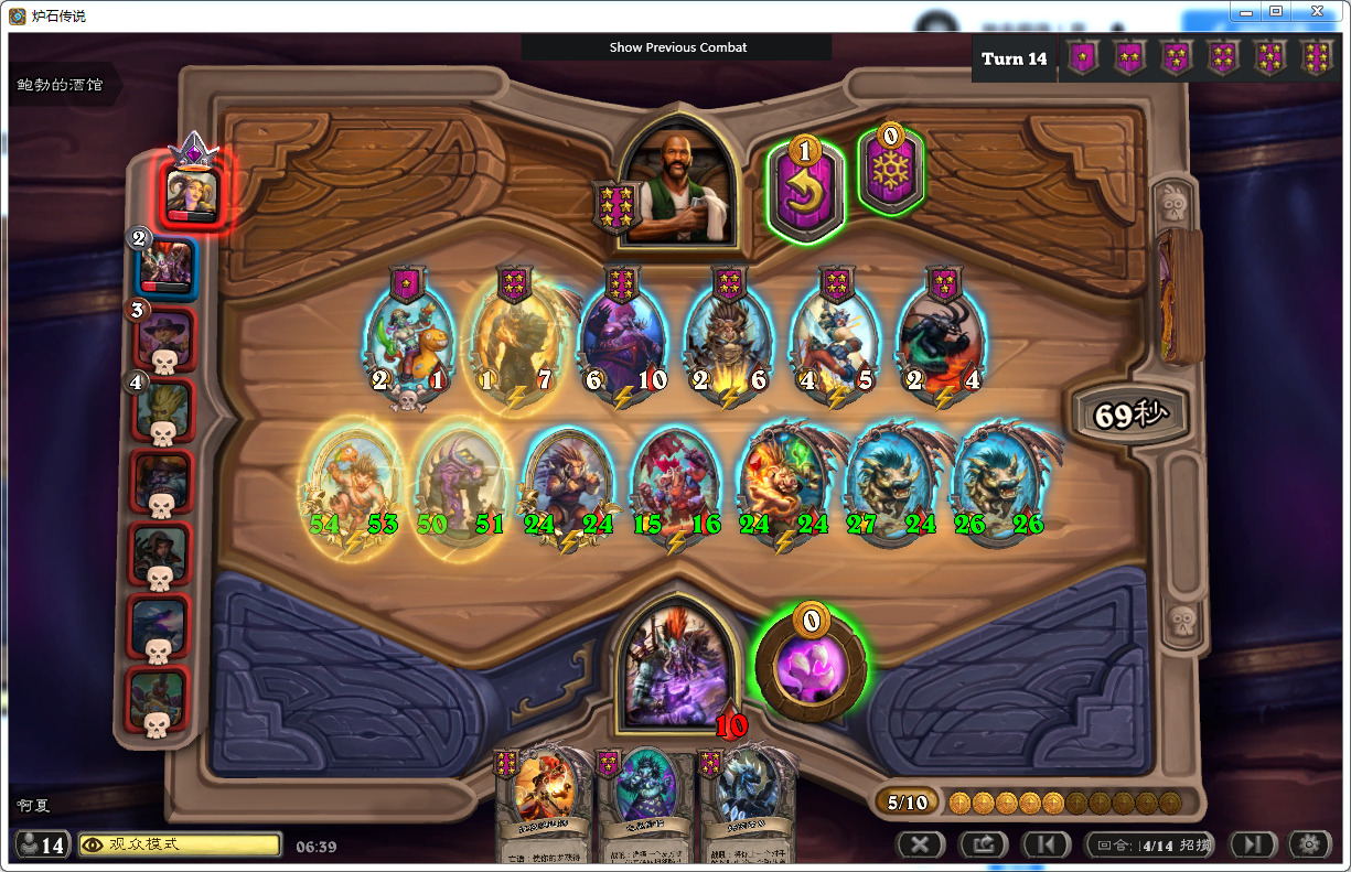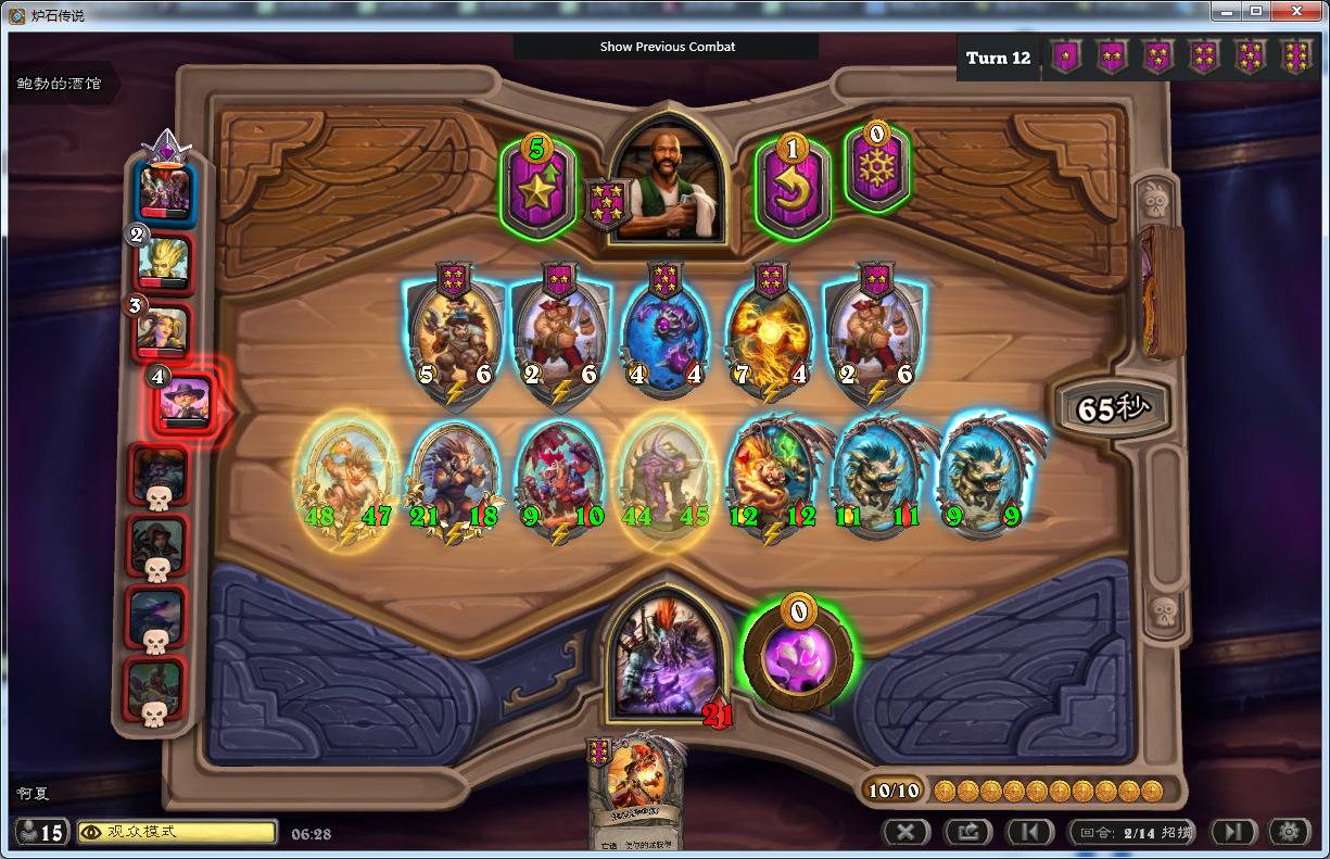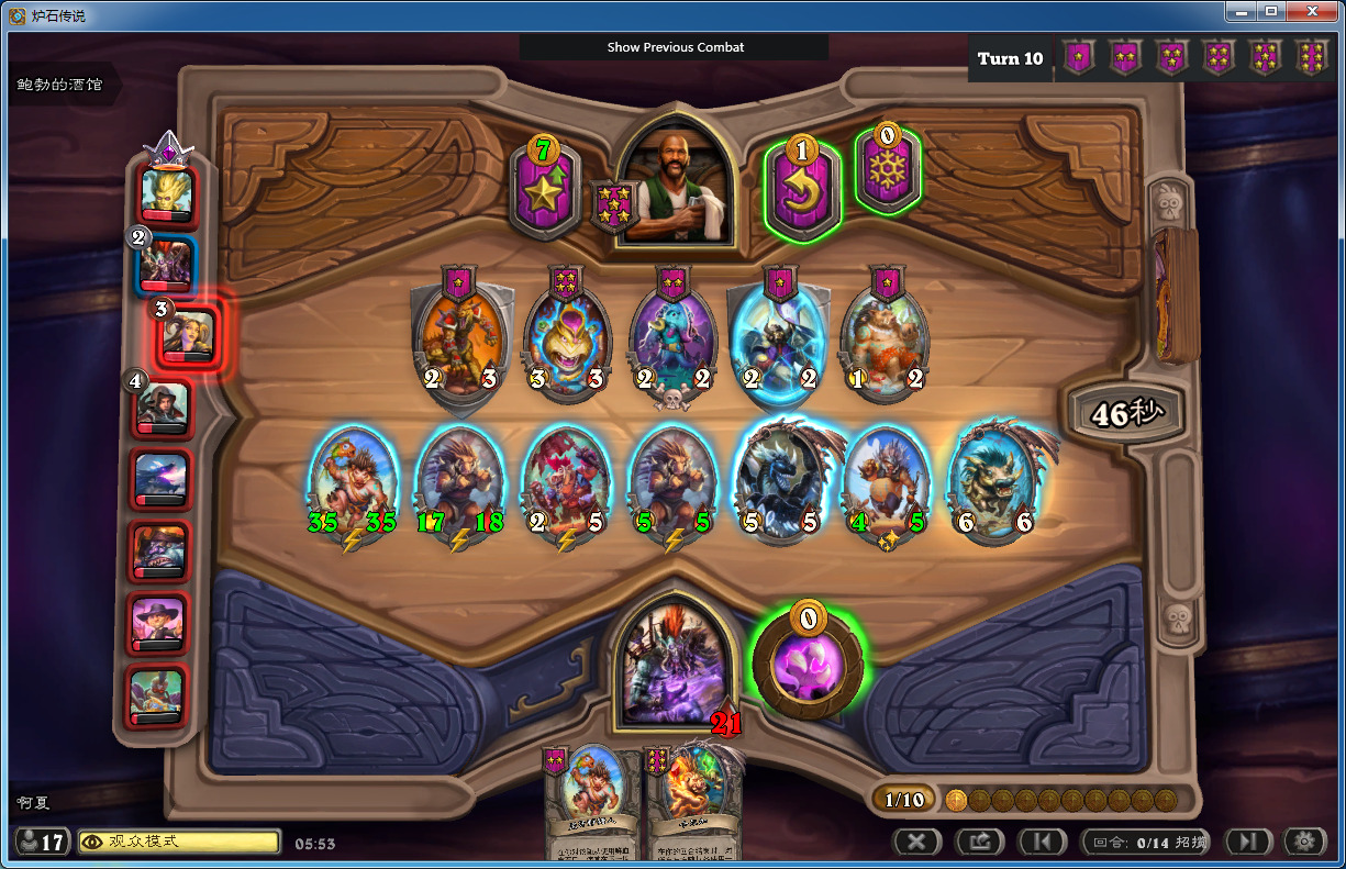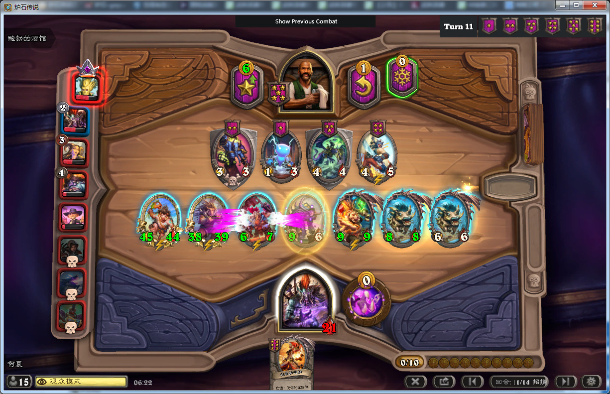 九回合上(11费):9回合开始,算是游戏的后期了,从这里开始,每回合死人就是常态了。心存侥幸者,都要被抬走。而我,一如既往的,鲍勃搞我。而这篇攻略最精彩的部分,也从这里开始。这些随从放在以前的版本都是好东西,但野猪人压根瞧不上他们。我D了一手。
