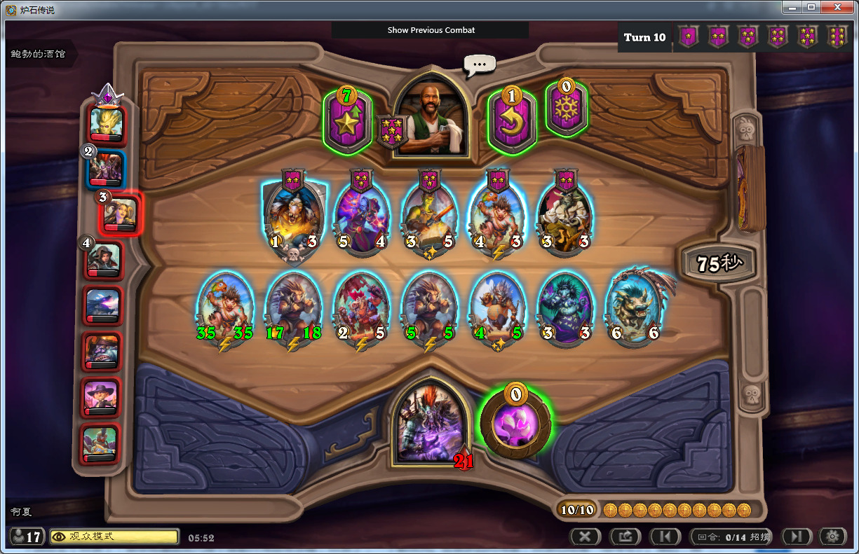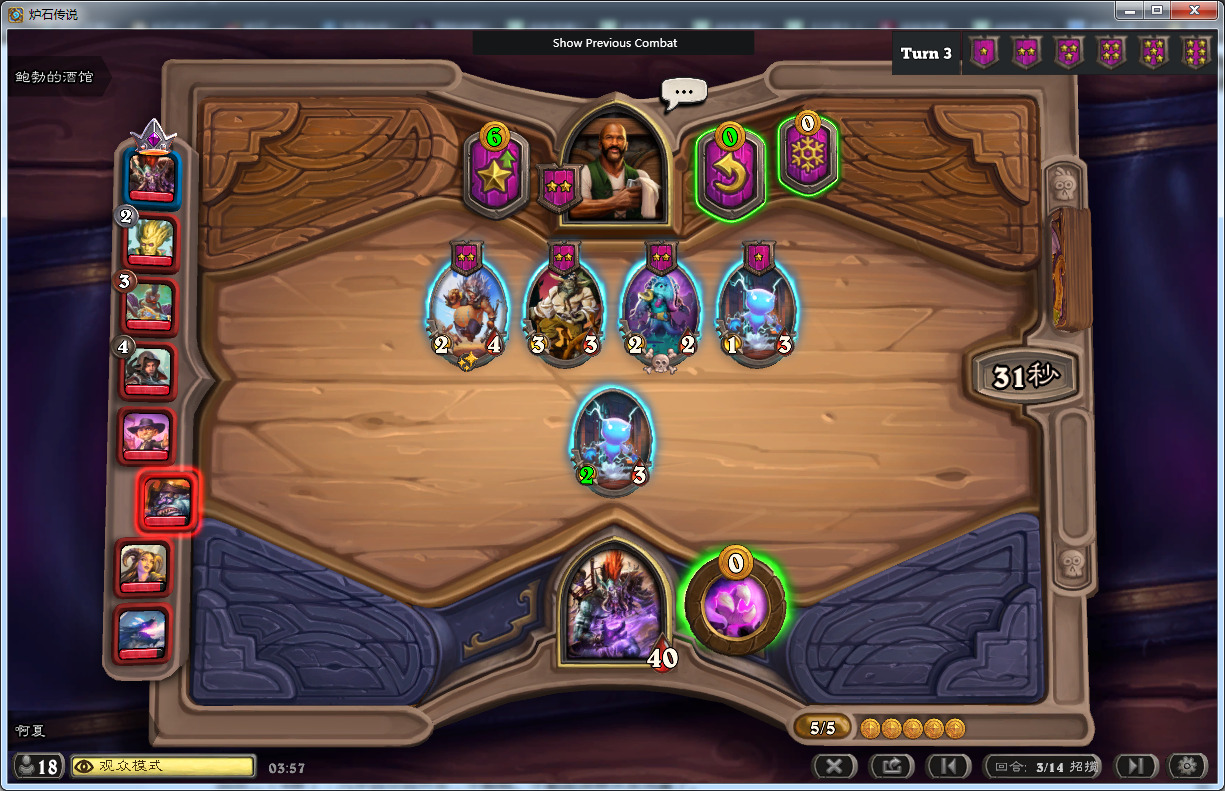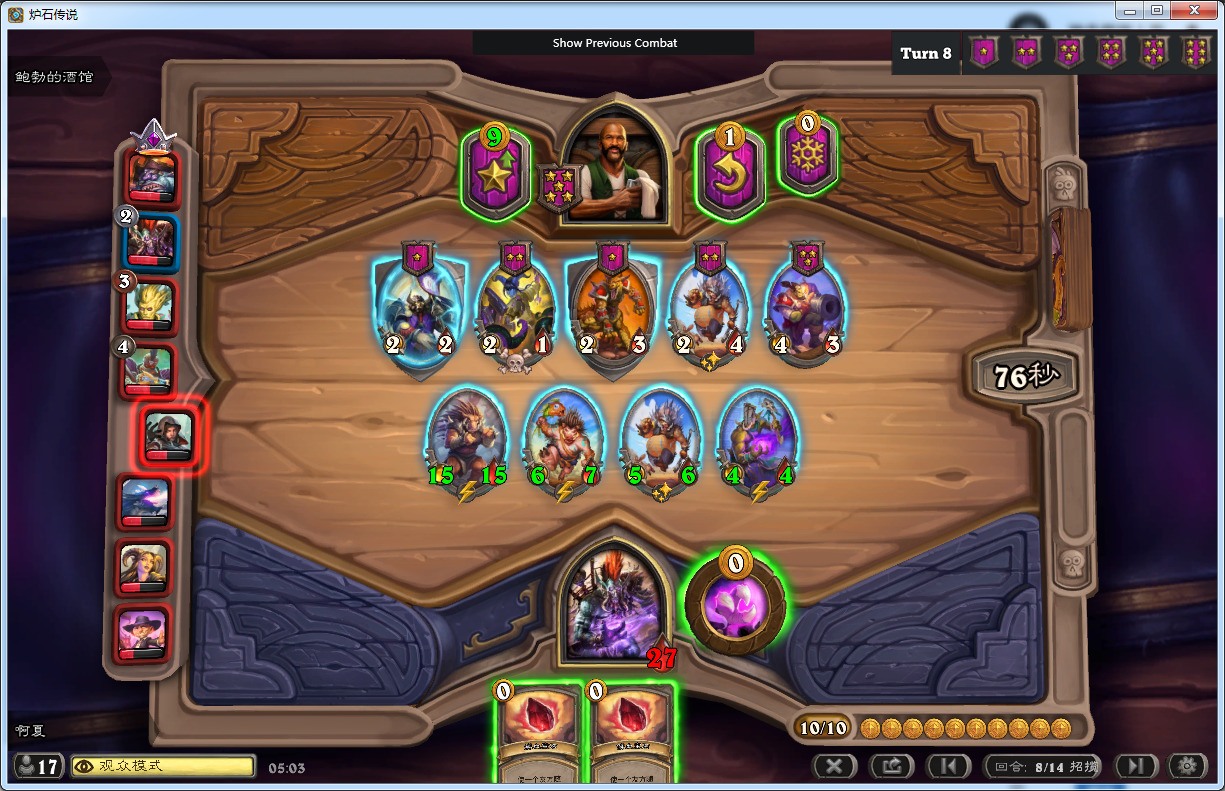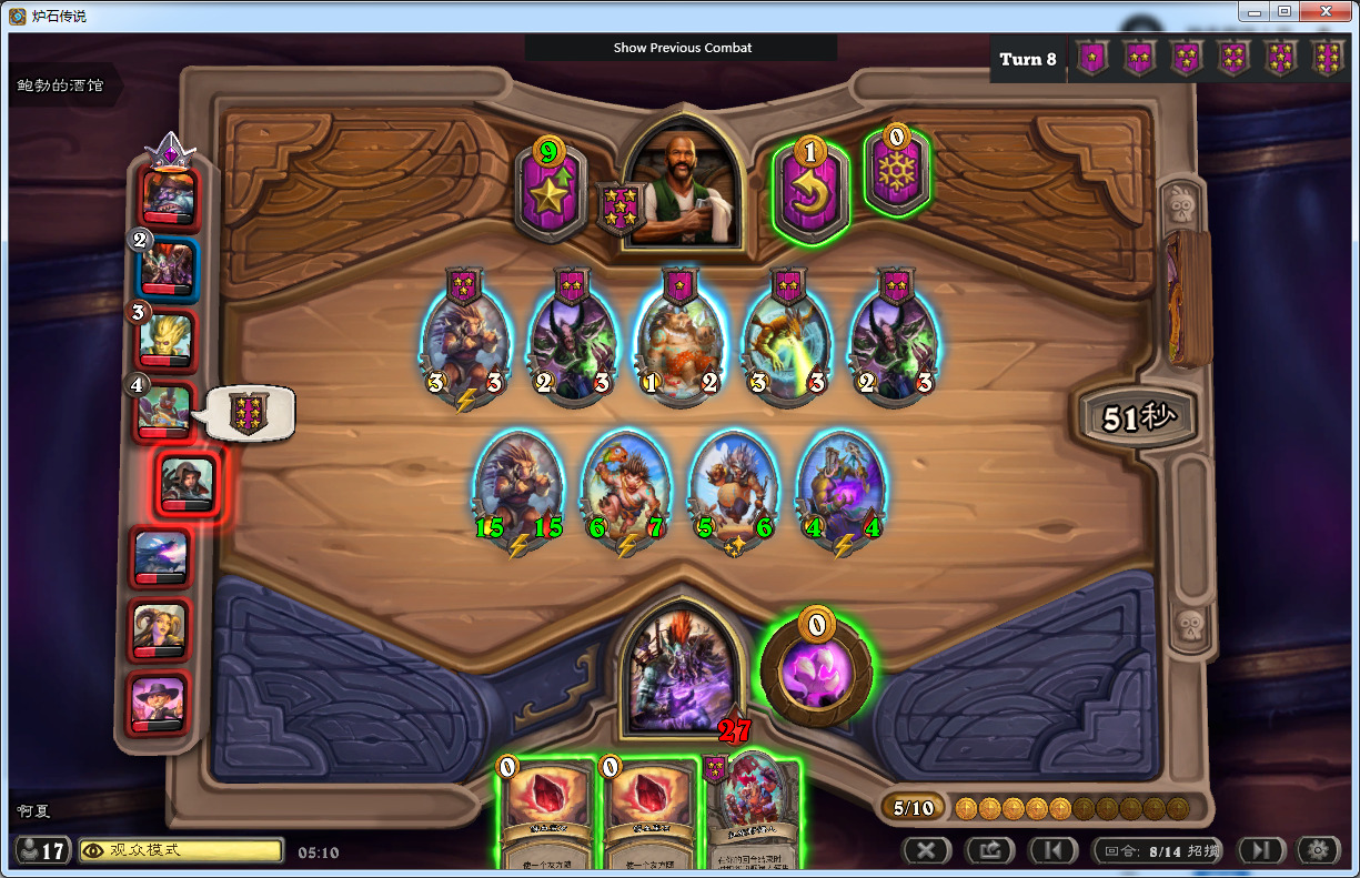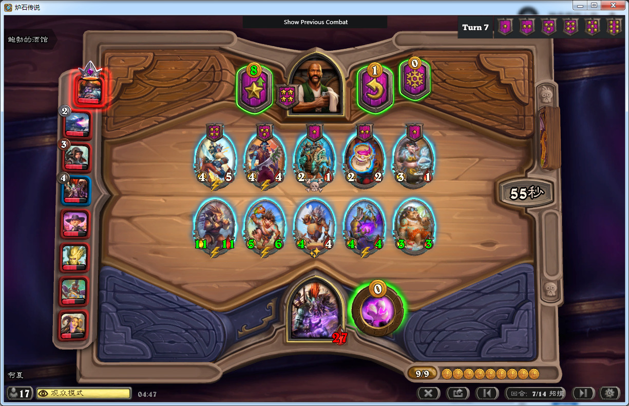 九回合上(11费):9回合开始,算是游戏的后期了,从这里开始,每回合死人就是常态了。心存侥幸者,都要被抬走。而我,一如既往的,鲍勃搞我。而这篇攻略最精彩的部分,也从这里开始。这些随从放在以前的版本都是好东西,但野猪人压根瞧不上他们。我D了一手。