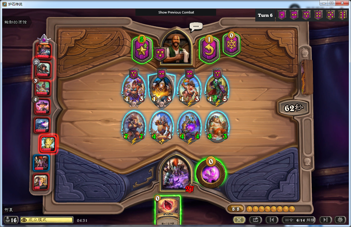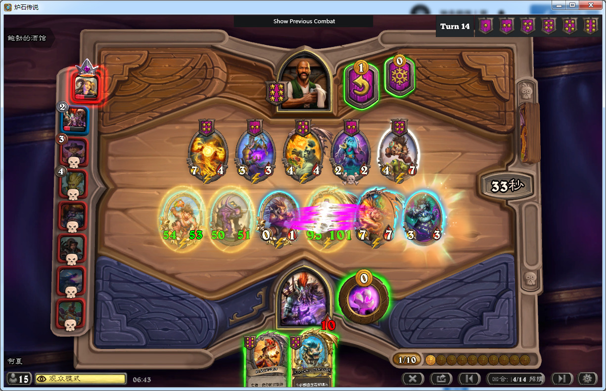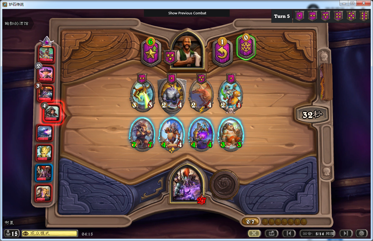 回合五下(7费):果然,我这样的非酋是第一时间没给的牌,再刷一次也不可能拥有。此时我把24野猪人的身材换成了44。