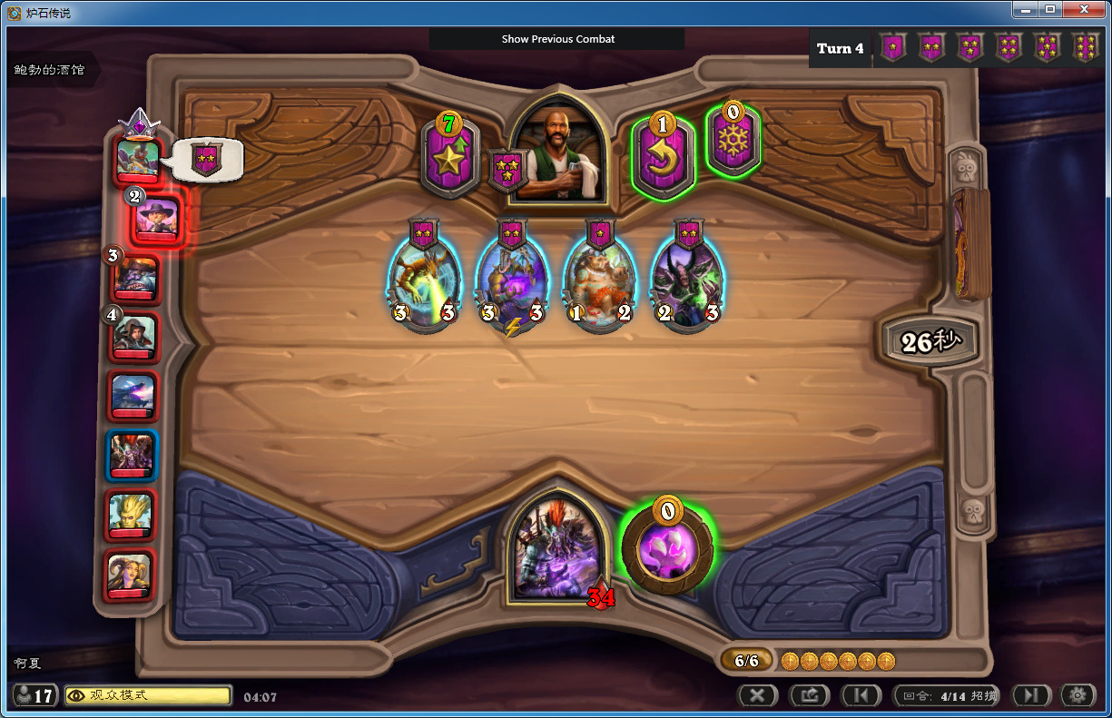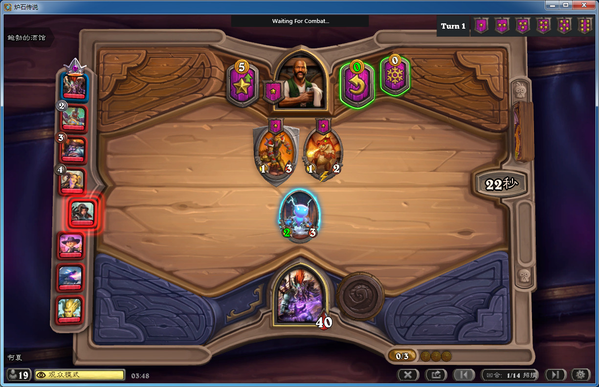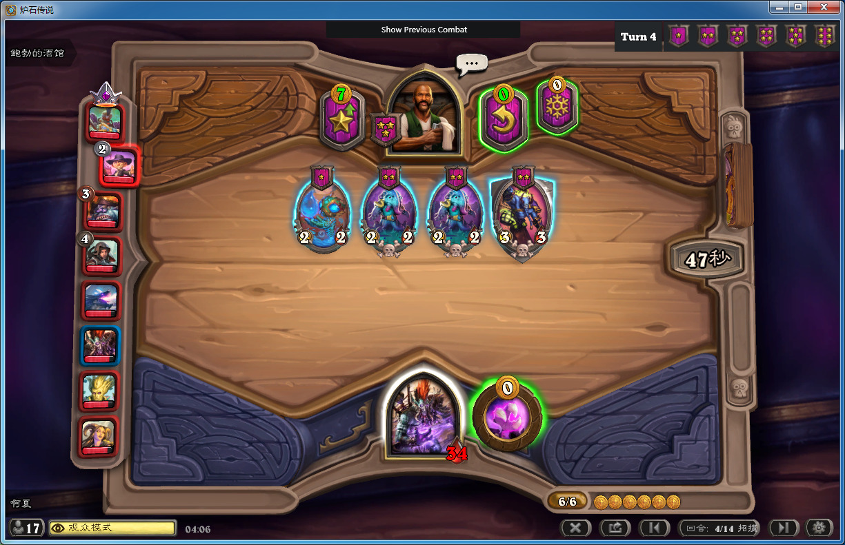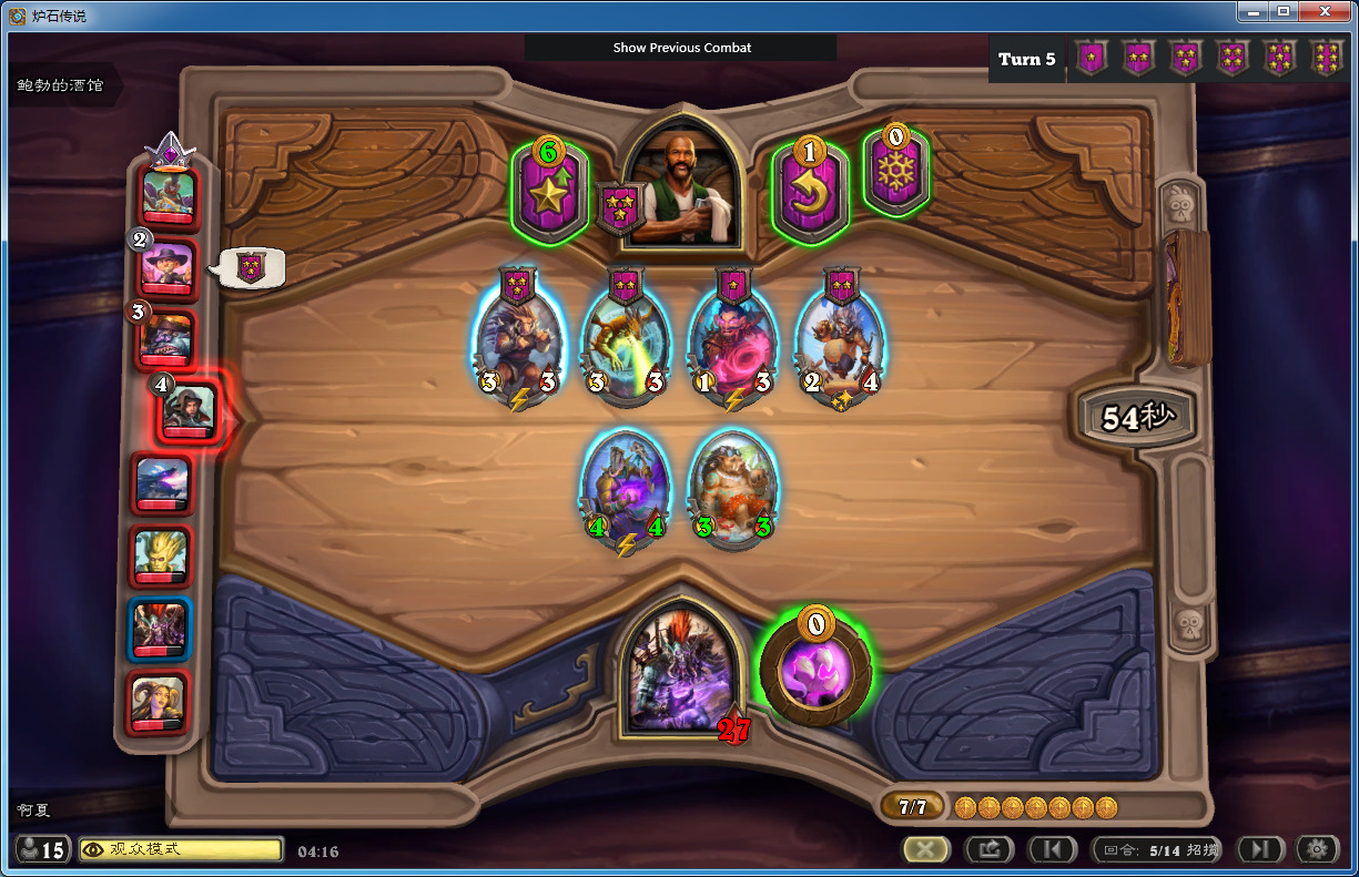 回合五下(7费):果然,我这样的非酋是第一时间没给的牌,再刷一次也不可能拥有。此时我把24野猪人的身材换成了44。