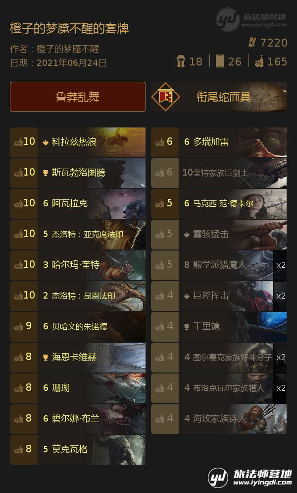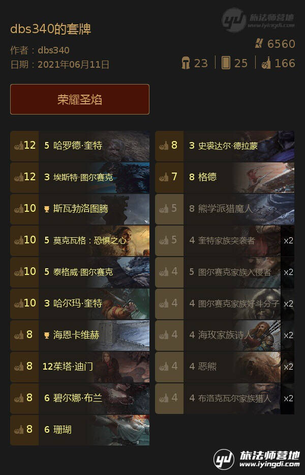 卡组思路:与常规小叶子思路相差不大,邓卡存点,R2可以用艾思娜,大橡树等进行逼牌,R3尽量剩下戈多以及不需要回合数的大金,例如森林保护者这种牌。