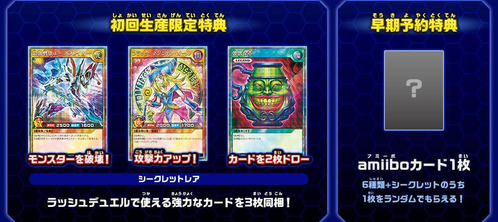 预购《游戏王Rush Duel:最强大逃杀》的用户初期将收到一张随机的Amiibo卡,其中包含以下七个角色之一:王道游我、上城龙久、苍月学人、雾岛萝敏、雾岛洛亚、西园寺宁琉以及一个秘密角色。