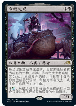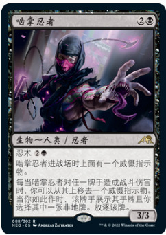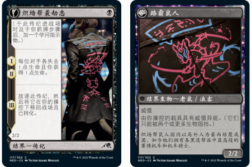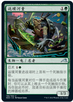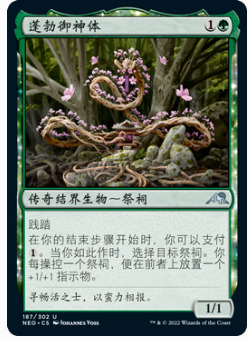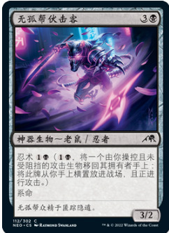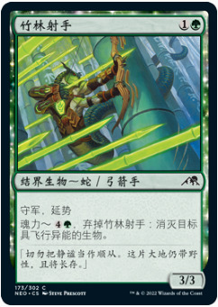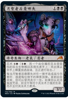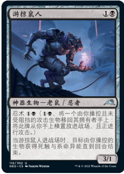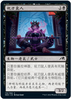 俗称老鼠结界,一费即能稳定打出4点血差,其中的2点回血对于纵使延缓2出人难免挨打的传记来说无疑是能够回复状态的雪中送炭,1费22威慑,进可攻退可守,是黑绿传记思路强度来源之一。属于是有多少抓多少的存在,遗憾的是,随着玩家们对神河环境的理解逐渐加深,以及黑绿传记思路流传开来,老鼠结界的越来越难抓到了。抓位稍高蛇圣濑四郎传说一些,但在缺乏高费致胜时,还是应该抓蛇圣濑四郎传说。