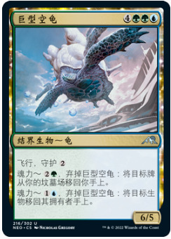 飞天乌龟加新生季节无限捞就不用多介绍了吧。自身还非常能打,是一个致胜维度。抓到它完全可以混蓝,不用混太深,为它带太多海岛,本身就只要1点蓝,而且卡色一样能发挥作用。我对树海幻视师茂树这张强牌之所以评价较低,就是因为有大乌龟这替代品。