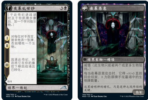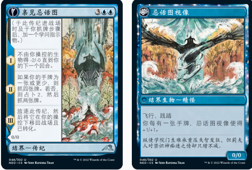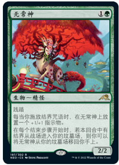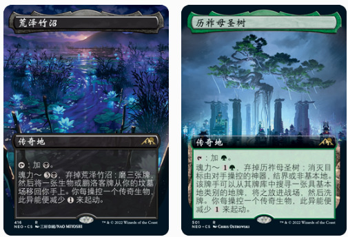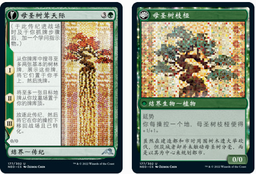 母圣树耸天际这张牌是黑绿传记以及绿X色变种中除开秘稀和金,银铁中当之无愧的第一抓位,除开基本上可以无视的章节II,章节I的意义不仅在于赚了2张牌,更在于有这两张树林,基本上就告别地的烦恼,章节III转化出来的更是一个足以拿下比赛的强大生物。