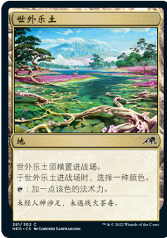 而世外乐土这张横进单色地也有一定的抓位优先级,因为它能提供良好的混色基础。虽然因为实在是太累了,没能介绍其他颜色传纪以外的值得混色的炸弹,但神河中这种值得混色的炸弹还是挺多的,一点有色法术力还好,如果是秘稀精怪龙那种两点有色法术力的,混色就比较吃力了。而调色个人觉得还是从地本身上解决比较好,如果是指望2G结界和无色神器,则容易降低卡组质量,和资源,这点和黑绿打资源的思路不太契合。