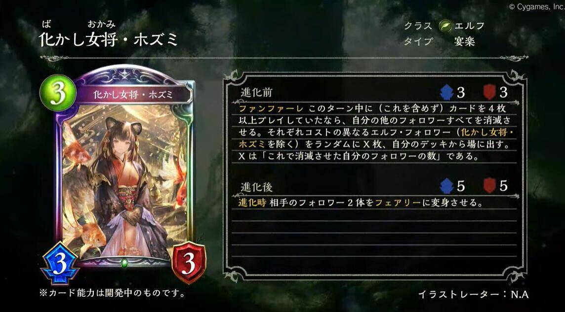 入场曲 如果本回合中自己已使用的卡牌(不包括本牌)数量为4或以上,则会令自己的所有其他随从消失。然后从牌堆中随机召唤X个消耗各不相同的精灵随从(此牌除外)到战场上。X为“此效果消失的自己的随从的数量”。