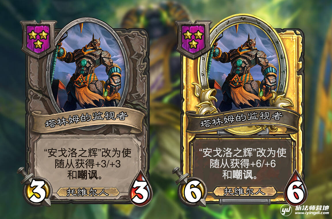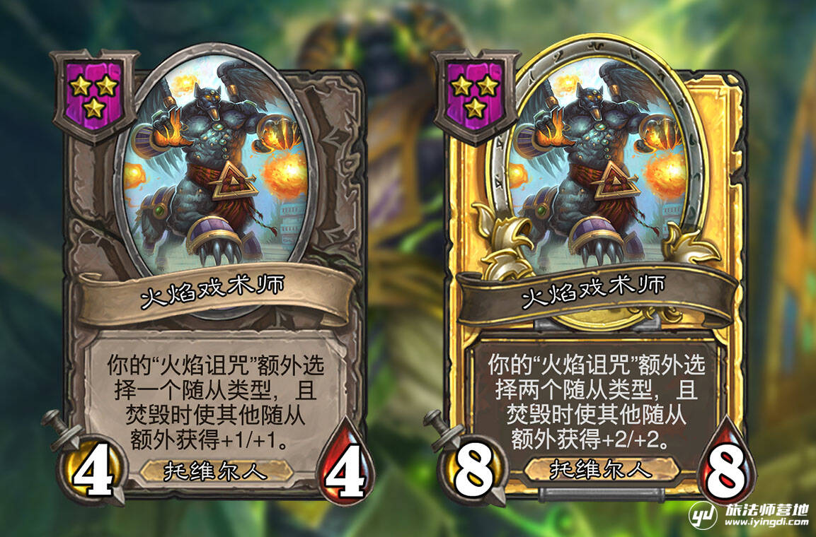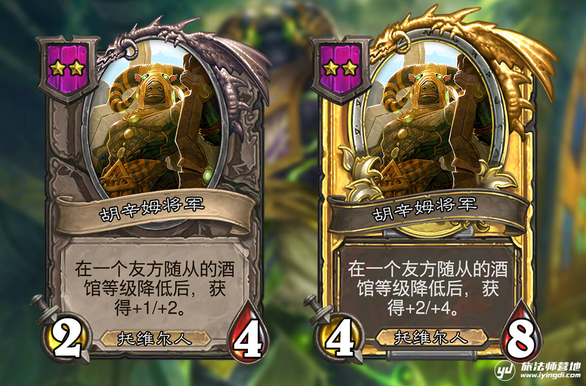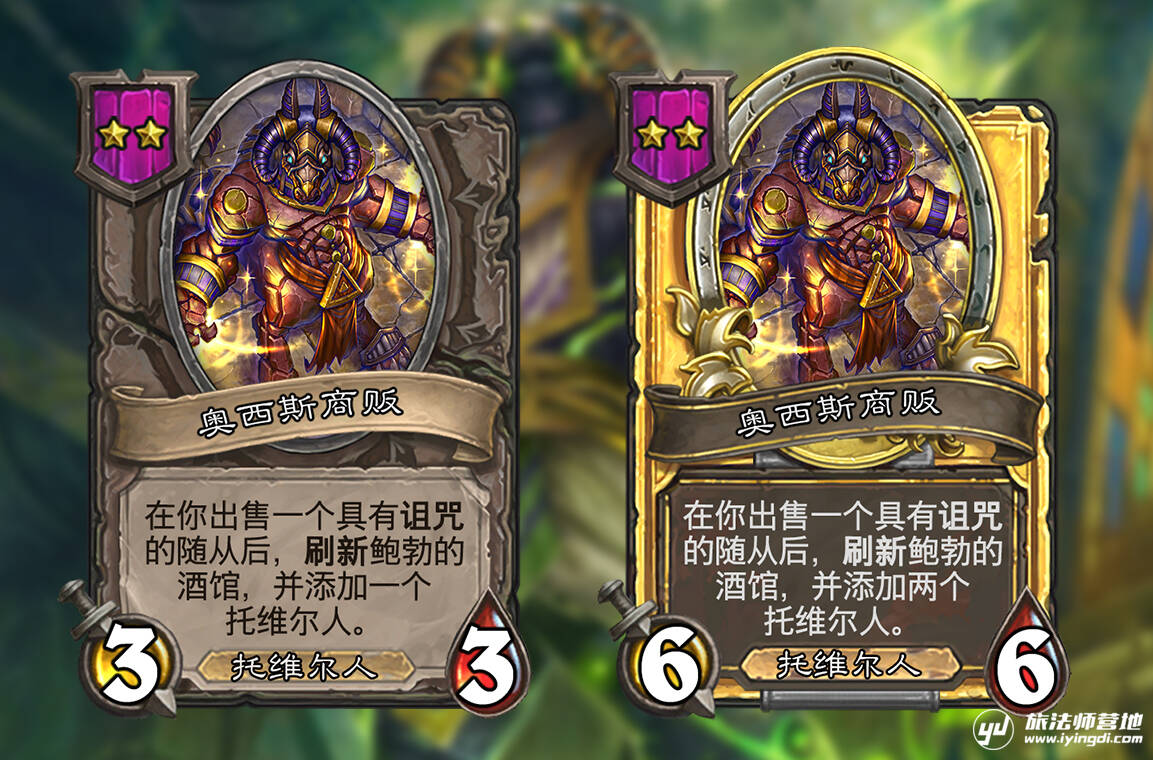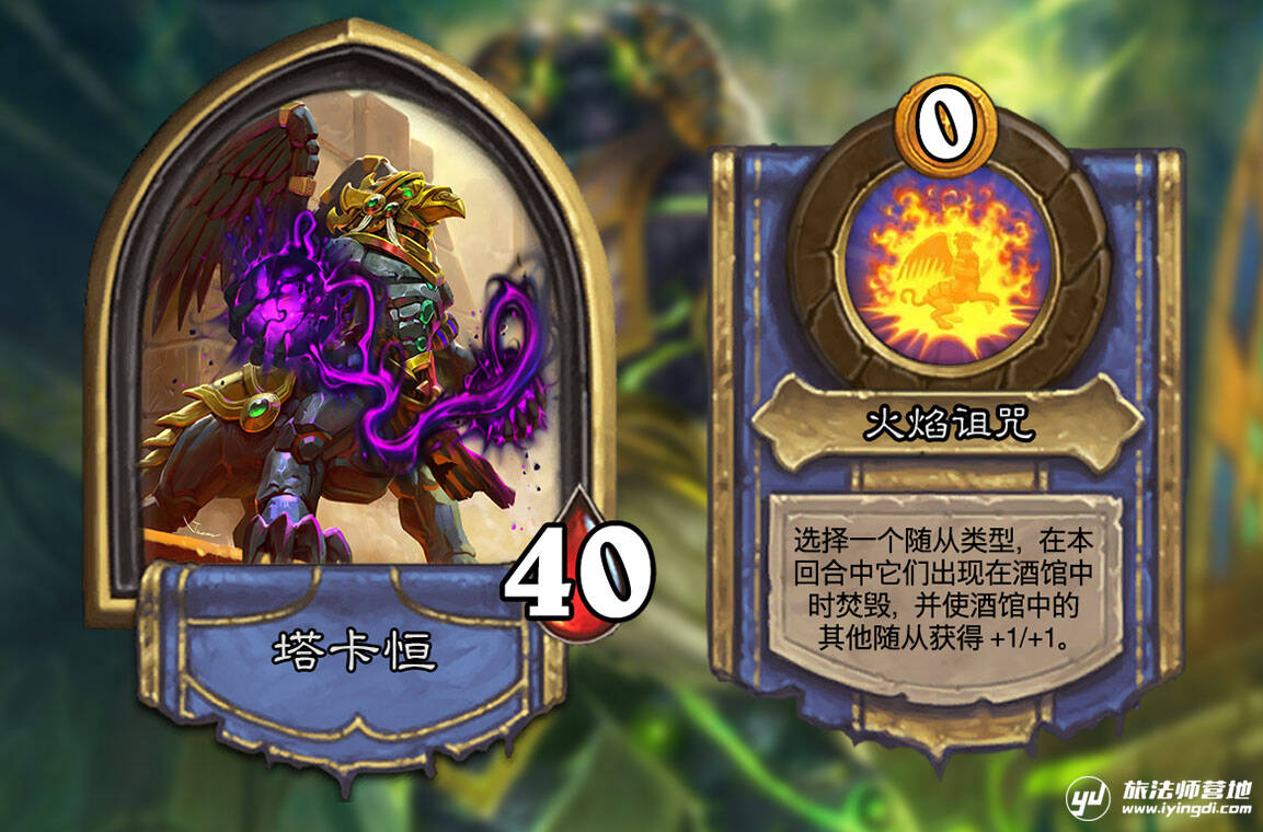 当选择的随从类型的随从出现在酒馆时,会立刻焚毁(移除),然后使此时鲍勃的酒馆里的其他随从获得+1/+1。