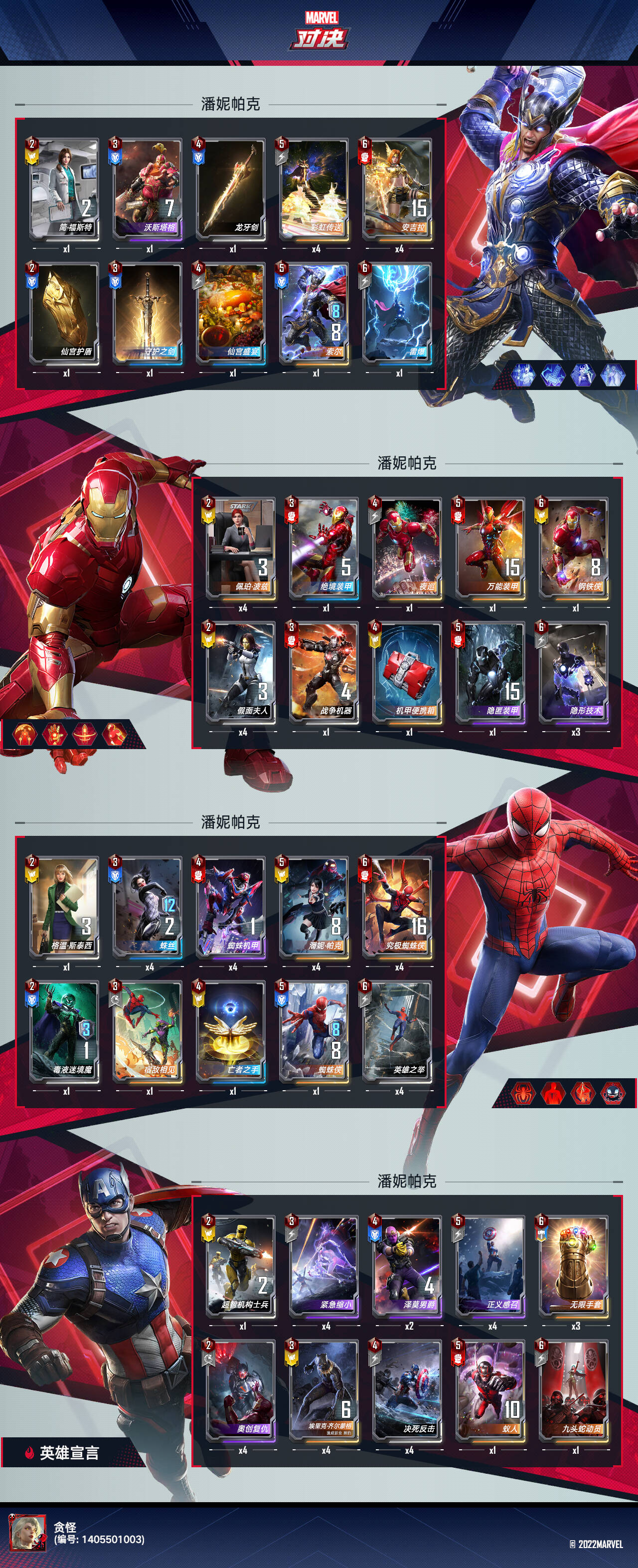 蜘蛛侠这边,3费卡4张蛛丝拉满晕人,后期也有比较高的战力让对面撞。选择带蛛丝喷射还是宿敌相见看个人,喷射如果拉满有点卡手,宿敌相见带一张可以在刚遇到迷境魔的时候也能对打。潘妮帕克的各个组件就不解释了。6费的究极蜘蛛侠能在面对感觉打不过的阵容的时候可以直接手套,特别是打索尔终幕陪上导弹。