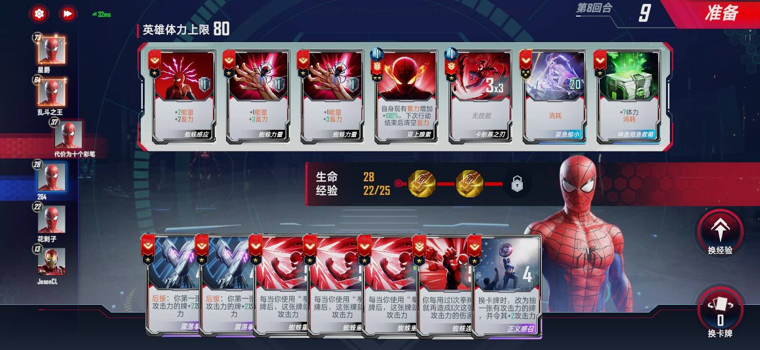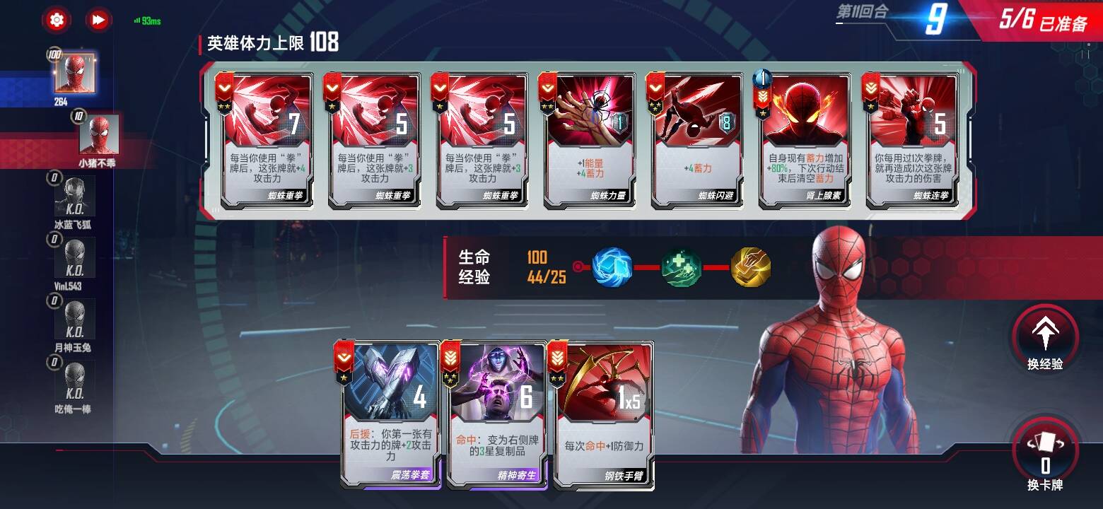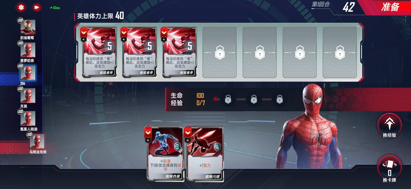 当然,这种情况比较理想,但是实际上通过游戏机制来看不是很难,蜘蛛侠的锁定卡只有四个流派:蛛丝、蓄力、打拳、叠甲。叠甲大多数核心都在高本不考虑。蛛丝数量很多,蓄力也很多,不过蓄力牌占比感觉上比多重攻击收益牌更多,拿不到收益牌,蓄的那两三点力还不如直接普通攻击打四。而拳虽然最少,但是普通拳第一回合就能拿到而且是蜘蛛侠职业的天胡开局,拿到连续拳补蓄力就可以了。