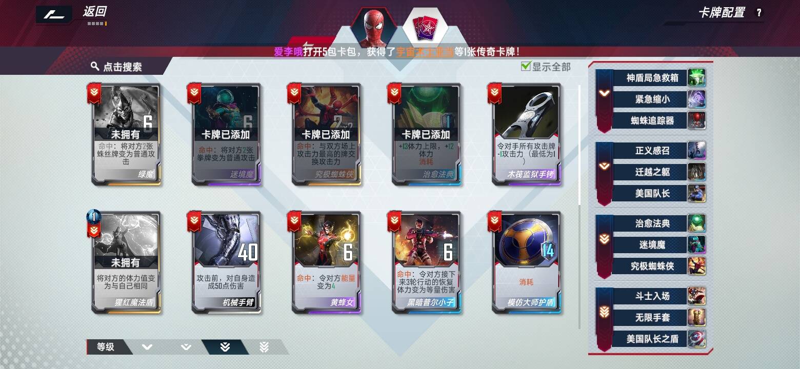 四本带了美队盾、斗士入场和手套。斗士一开双手放开,美队盾可以你走叠甲。一本有一个一张卡+3能量,跌两星直接打手套,只要不打掉斗士入场就是赚到。