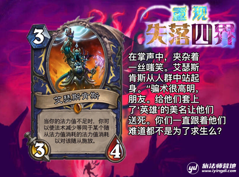 萨满卡牌“艾瑟斯肯斯”:当你的法力值消耗不够时,系统尽可能找到一个场上最低费怪,你的法术费用减少等同于怪的费,直到法术能施放。你也可以对 比找到的那个怪费还高的怪施放法术,施放后会复原等同于两者费用差值的法力值。“目标几费就少花几费”