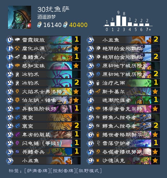 这套牌的打法思路大致是前期利用鱼人体系进行站场以及滤牌,以达到【苟命以及让沙德沃克尽快上手的作用】。 第一波在六费阶段较为胡牌时可凑齐【小丑鱼】、【锤喙】、【斯卡基尔】以及【其它战吼鱼人】进行一波超展开(在【雷霆绽放】没来之前【迷潮挖掘者】尽量留在手上,后文有comb),如果手上鱼多或【鳄鱼人掠夺者/冰钓术】在手上且【锤喙】没上手时可提前打出【小丑鱼】减费,尽快进行展开。 第二波则是【沙德沃克的无限“全封”】【撼地元素】/【奇兵】有机会则优先打出,手上留一张【雷霆绽放】配合技能可以做到稳定无限【沙导】,在此基础上再找【雪落】、【遏制他们的魔法/随从】打出即可。 注意事项: 1.在使用【博学者】之后可以接着打出【迷潮挖掘者】进行探底可以稳定探到【雷霆绽放】。 2.尽量让质量高的战吼效果排在每回合的最后一个,可以避免鹦鹉上手时复制的战吼发挥不出作用。 最后祝大家上分愉快,如果你觉得这个思路对你有帮助的话不要忘记给我点个赞喔~