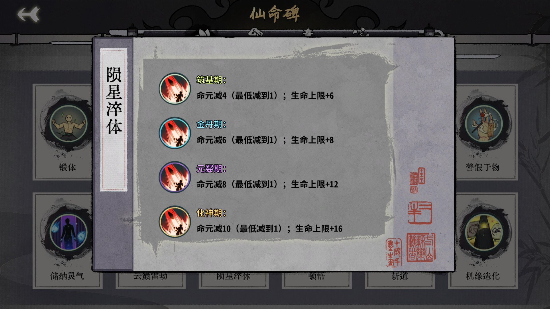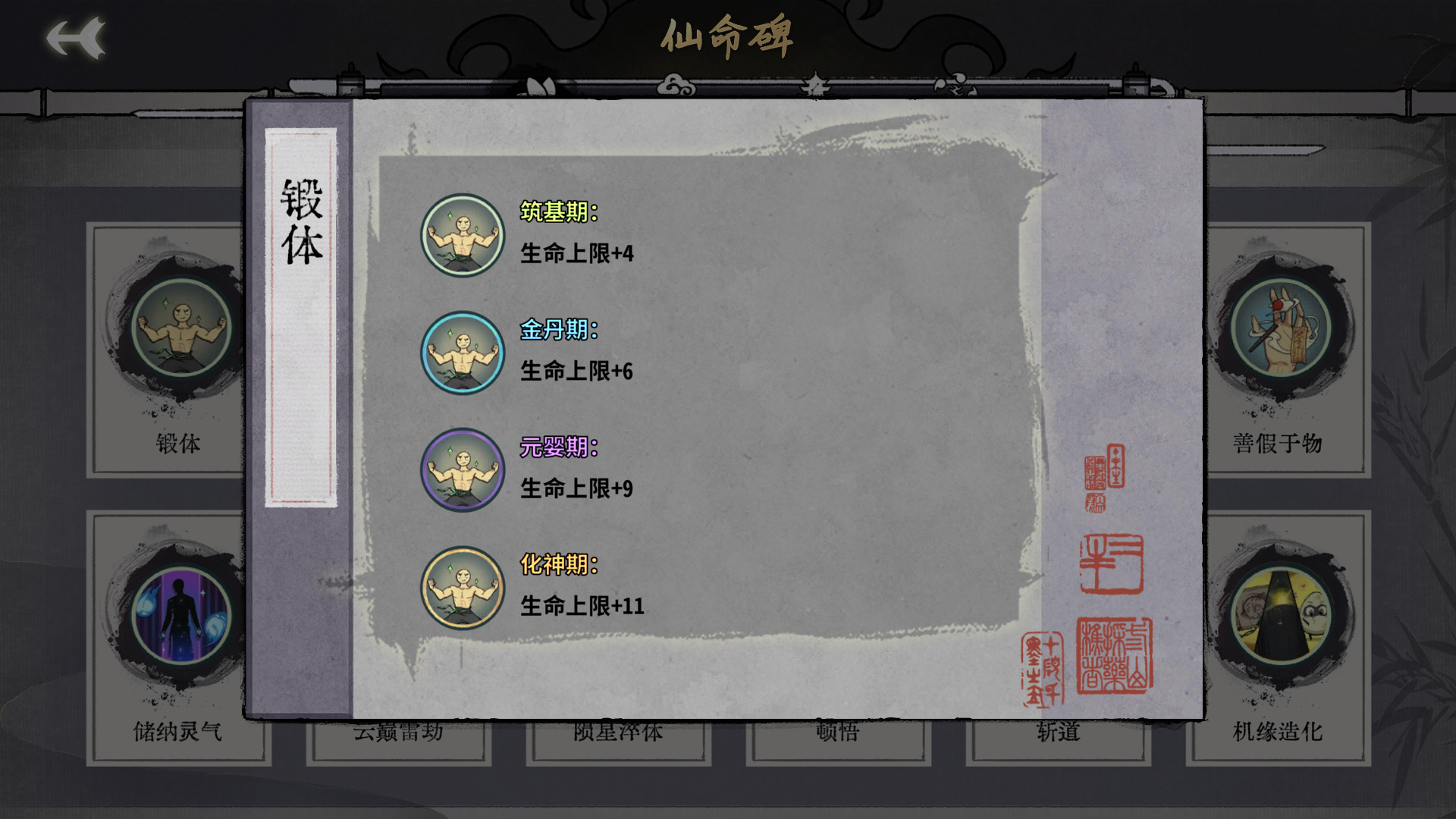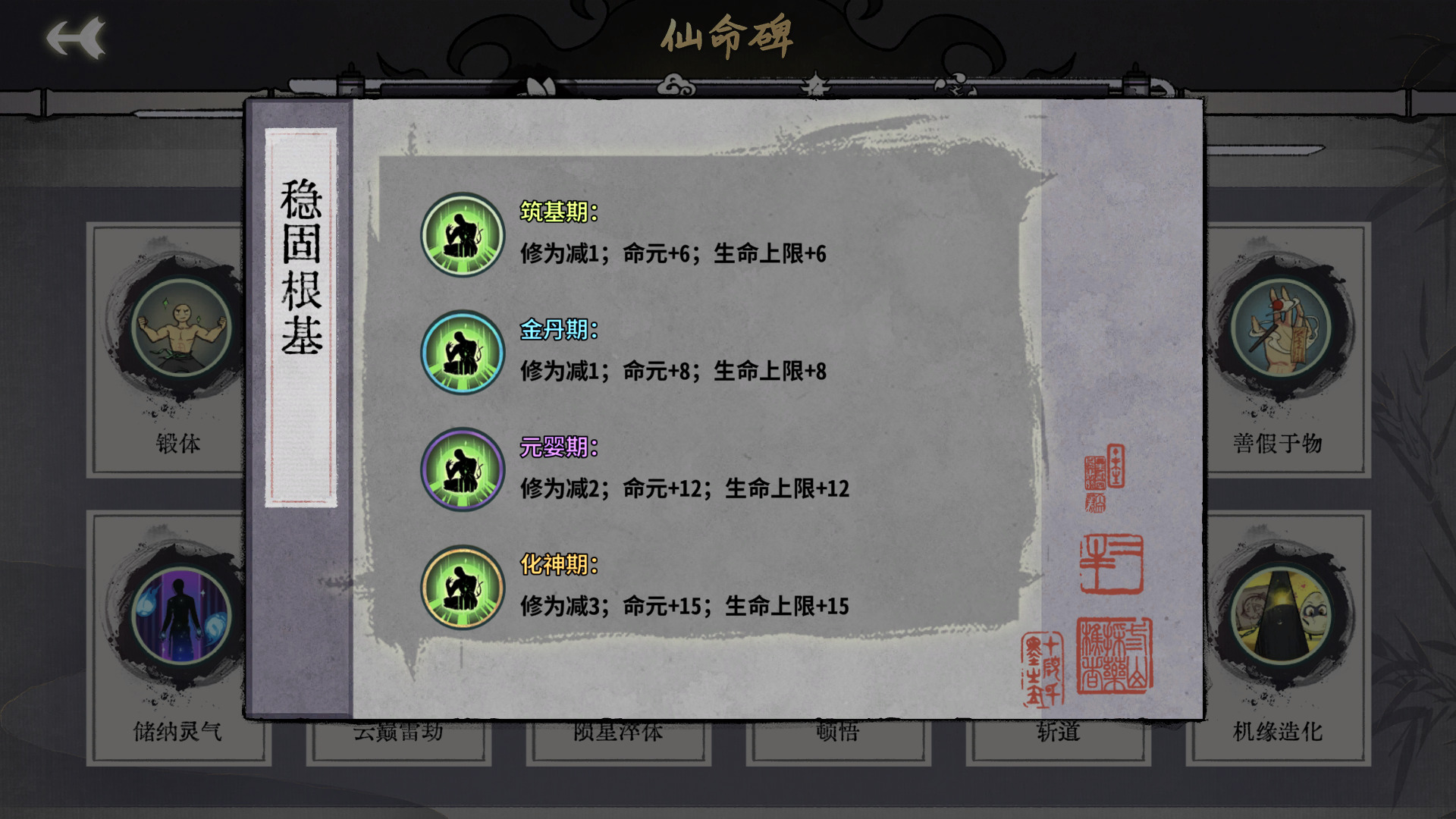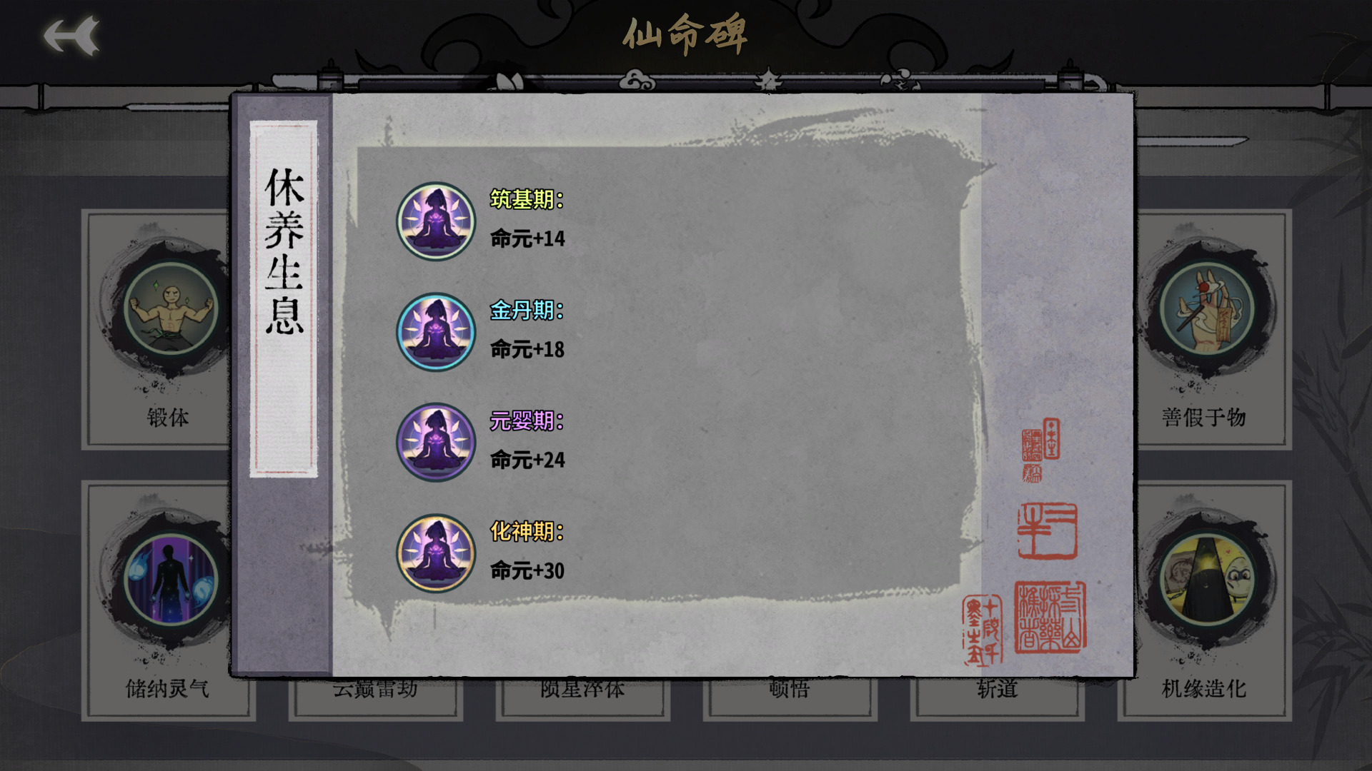 修为的减少可以忽略不记,基本没啥影响,效果就是锻体和休养生息的综合,但是同期生命上限比锻体加的多,可以说是完爆锻体了,命元同层次加的大概比休养生息减半的样子。总之可能会丢点先手,但是容错能力大加强,什么时候都可以选择。