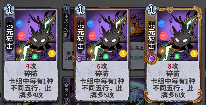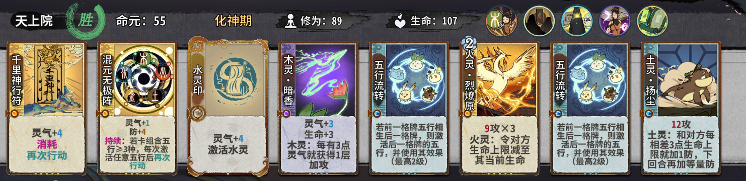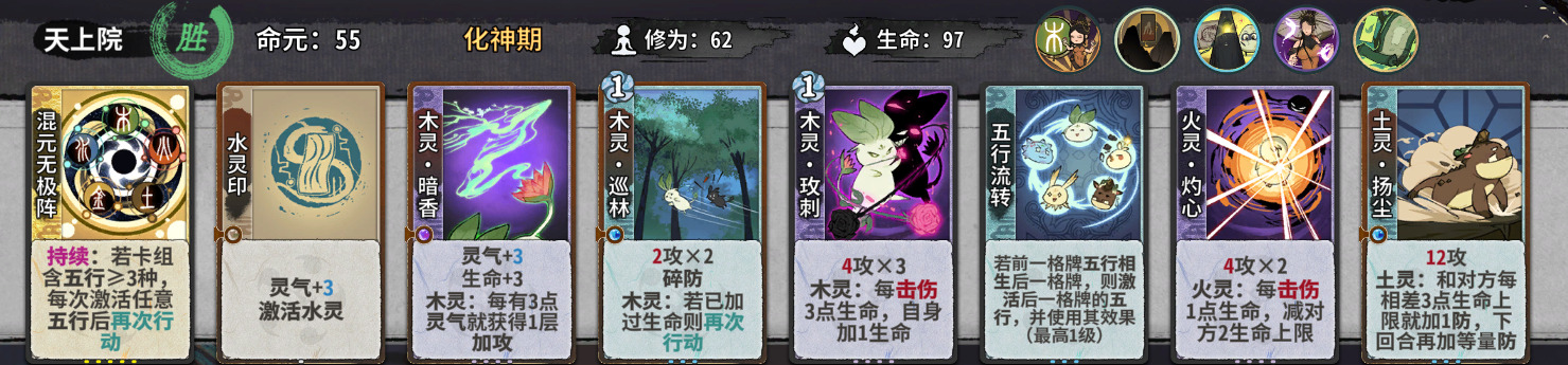 这套打法的核心就是混元无极阵和五行流转。混元无极阵可以在你激活五行的时候触发再动,而五行流转刚好可以激活后一张五行。前几张卡叠灵力和加攻,烈燎原输出和降低敌人血量上限,扬尘补输出,如果输出不够还能根据血量上限差距叠两回合盾,下一轮烈燎原很快又能输出。真正做到了高爆发、高速度、高生存,堪称全能选手
