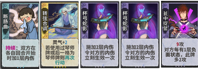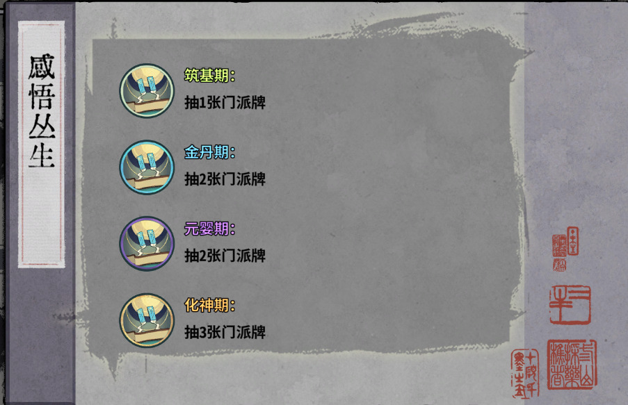 首先是[感悟丛生]和[善假于物],获得门派牌和副职牌,加速检索内伤词条的卡牌帮助我们的阵容成型,再不济也是一点两点修为嘛,肯定不亏的。