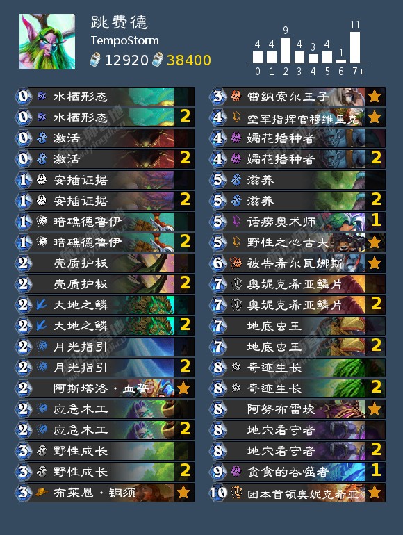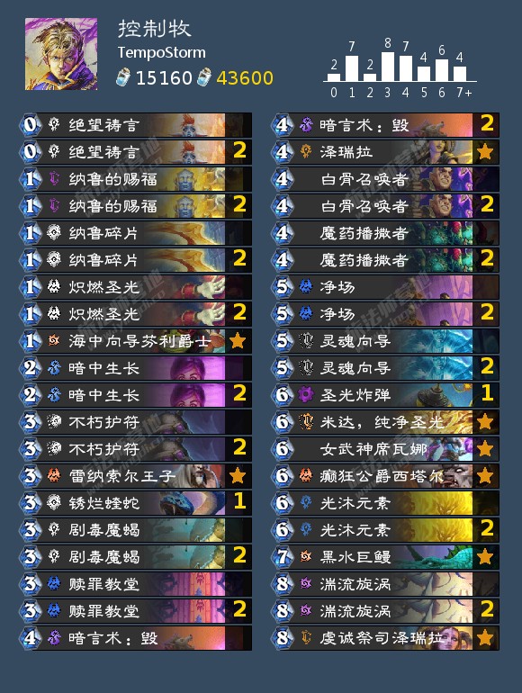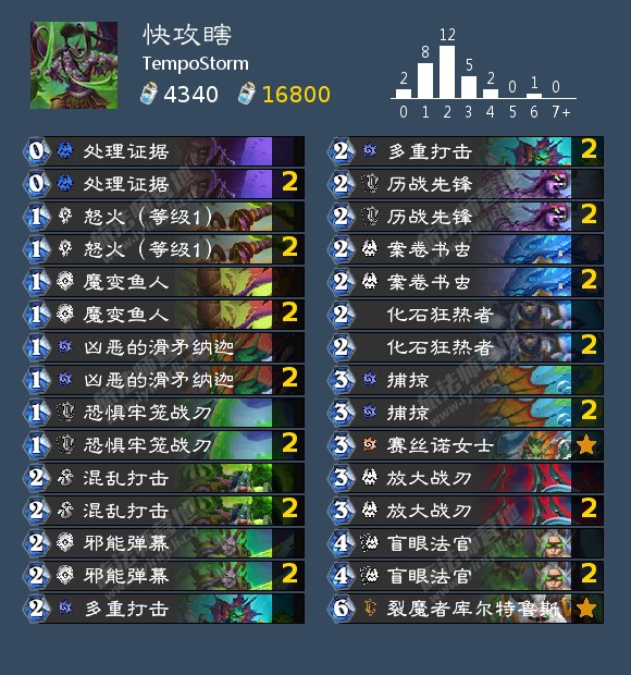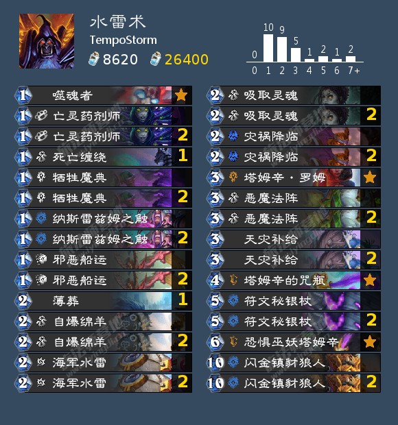 我们以@reqvahs的套牌为模板,他使用这套牌打到了传说第3名。这套牌带了很多抗快组件,目的主要是应付天梯中泛滥的快攻。